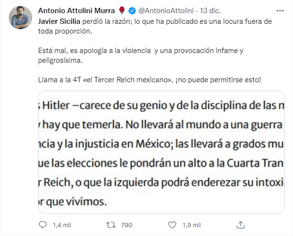El Presidente Andrés Manuel López Obrador dijo: “Ya se pasó”, respecto a los comentarios dichos por Javier Sicilia donde lo compara con Hitler. El Presidente recordó que desde 2012, cuando Javier Sicilia se encontraba con los candidatos presidenciales en foros con las víctimas de violencia y les dió un beso en la mejilla a todos, como sinónimo de fraternidad, AMLO se negó a recibirlo argumentando que “desde entonces lo sentía falso y no me equivoque”.El Presidente aseguró que las críticas a su gobierno como las que ya ha expresado el escritor en relación al mitin que realizó el 1 de diciembre en el Zócalo, son reflejo de su desesperación, coraje y odio, contra su proyecto de gobierno."Ya Sicilia se pasó, (compararme con) ‘Hitler’, imagínense eso, por la concentración por el mitin que hicimos, ¿cuántas veces nos hemos reunido en el Zócalo? Yo creo que podremos llegar ya a 100 veces ¿y antes no éramos Hitler? ¿es hasta ahora por reunirnos en el Zócalo? Pero es su desesperación, coraje, odio. Ojalá y recapaciten”. Señaló el mandatario."En el caso de Sicilia, cuando participaba más, me acuerdo que hubo un encuentro en Chapultepec y éramos candidatos y a todos besaba, o sea como una muestra de hermandad, de fraternidad, yo desde entonces lo sentí falso, y me quiso besar y dije no, a mí no me besó, besó a Josefina (Vázquez Mota), a (Enrique) Peña, y no me equivoqué", dijo.En el Palacio Nacional, el Presidente Andrés Manuel remarcó que por el bien de todos, incluyendo a las nuevas generaciones, no se puede tener un sistema político que se sostenga en simulaciones, demagogia y mentiras: "en el zigzagueo, en el acomodarse, el querer quedar bien, y olvidar principios, ideales, pero sobre todo, olvidar al pueblo, despreciar al pueblo", dijo"Porque para ellos el pueblo no existe, no cuenta, no le tienen afecto, cariño, ni respeto. La política es asunto de los de arriba, es de la cúpula, no le tienen amor al prójimo". remató el Presidente.DO