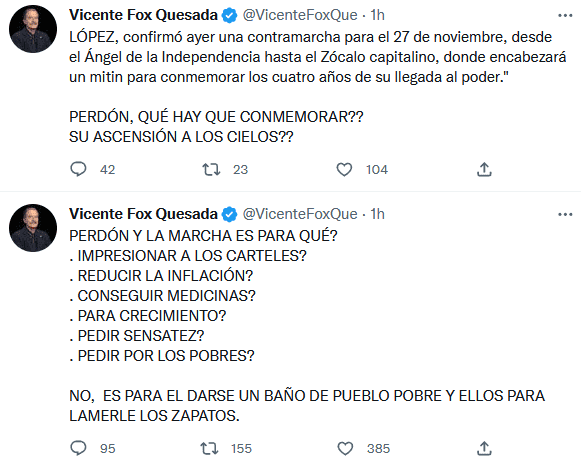 Luego de que el Presidente Andrés Manuel López Obrador asegurara que el próximo 27 de noviembre realizará una marcha con motivo de sus cuatro años de gobierno, las críticas en redes sociales por parte del expresidente Vicente Fox Quesada no han parado.Esta mañana, el exmandatario hizo cuestionamientos y advirtió que el objetivo del movimiento de López Obrador es "darse un baño de pueblo pobre"."Perdón y la marcha es para qué? Impresionar a los cárteles? Reducir la inflación? Conseguir medicinas? Para crecimiento? Pedir sensatez? Pedir para los pobres? No, es para él darse un baño de pueblo pobre y ellos para lamerle los zapatos", argumentó Fox Quesada.También aludió a que el Presidente ejecutará la marcha con el fin de conmemorar "su ascensión a los cielos".Este miércoles, durante su conferencia "mañanera", el presidente López Obrador anunció que llevará a cabo una marcha previa a su cuarto informe de gobierno, que se llevará a cabo el 1 de diciembre del 2022.De acuerdo con lo dicho por el Presidente, la movilización comenzará su recorrido en el Ángel de la Independencia, pasando por Paseo de la Reforma, para llegar al Zócalo de la Ciudad de México.OA