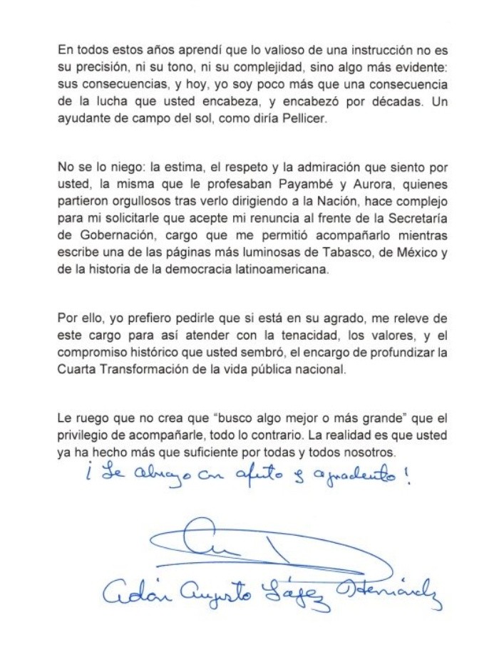 Adán Augusto López compartió en redes sociales la carta de renuncia como secretario de Gobernación, que entregó personalmente este viernes al Presidente Andrés Manuel López Obrador.En la carta de renuncia que entregó para contender por la candidatura presidencial de Morena, el ahora exsecretario de Gobernación recordó una conversación con López Obrador en marzo de 2005: "'Adán, ven a ayudarme'. Y desde entonces, hasta que la vida me lo permita, pretendo seguir cumpliéndola", compartió el también paisano del Presidente López Obrador.En el texto, Adán Augusto López recordó que esa fue la instrucción de López Obrador y también narró el inicio de la lucha que iniciaron juntos "cuando los oligarcas se sentían dueños del país"."Por ello, yo prefiero pedirle, que si está en su agrado, que releve de este cargo para así atender con la tenacidad, los valores y el compromiso histórico que usted sembró, el encargo de profundizar la Cuarta Transformación."Le ruego que no crea que 'busco algo mejor o más grande' que el privilegio acompañarlo, todo lo contrario. La realidad es que usted ya ha hecho suficiente por todas y todos nosotros", escribió. "Lo abrazo con afecto y agradecimiento", también se lee al final del texto."Dicen que soy hombre de pocas palabras, pero nunca escatimaré agradecimiento y gratitud a quien, con su ejemplo, trayectoria y lucha, cambio el rumbo de la nación", fue el texto con el que compartió la carta. vll