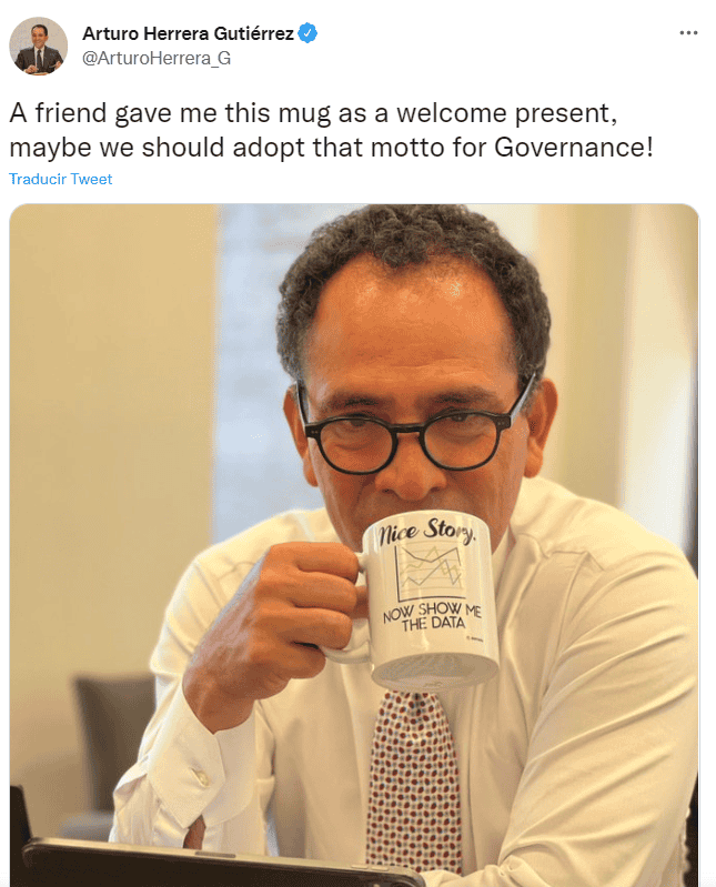 El ex secretario de Hacienda y Crédito Público, Arturo Herrera, habría lanzado una indirecta para el Gobierno del Presidente de México, Andrés Manuel López Obrador. Y es que un día después de que López Obrador ofreciera su Cuarto Informe de Gobierno, el actual director global de Gobierno del Banco Mundial posteó una imagen en su cuenta de Twitter con un mensaje donde estaría criticando al Presidente de México. En la imagen, aparece Arturo Herrera tomando una bebida de una taza que tiene la leyenda: “Nice story. Now show me the data” (Buena historia. Ahora muéstrame los datos). “Un amigo me dio esta taza como regalo de bienvenida, ¡tal vez deberíamos adoptar ese lema para Gobernanza!”, tuiteó el exfuncionario mexicano. Cabe recordar que Arturo Herrera renunció a la Secretaría de Hacienda meses después de que López Obrador retirara su postulación para dirigir el Banco de México. Ayer jueves 1 de septiembre, el Presidente de México ofreció su cuarto Informe de Gobierno donde destacó que "a pesar de las adversidades, estamos saliendo adelante".GC