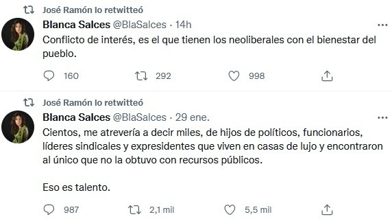 Luego de que el periodista Carlos Loret de Mola publicó un reportaje sobre los autos de lujo y casonas en Houston del hijo mayor del Presidente Andrés Manuel López Obrador (AMLO), que contrastan con su discurso de una vida austera, José Ramón López Beltrán compartió en Twitter el mensaje de una usuaria "en su defensa".En medio de retuits de quotes de Mafalda, de mensajes de Claudia Sheinbaum, de imágenes de la WWE, de juegos del tenista Rafael Nadal, así como publicaciones de baseball, Tom Brady, caricaturas políticas y comentarios del periodista deportivo David Faitelson, el hijo mayor del presidente de México difundió el mensaje de la usuaria Blanca Salces (@BlaSalces)."Cientos, me atrevería a decir miles, de hijos de políticos, funcionarios, líderes sindicales y expresidentes que viven en casas de lujo y encontraron al único que no la obtuvo con recursos públicos. Eso es talento", escribió la usuaria en un primer mensaje.López Beltrán compartió un segundo mensaje: "Conflicto de interés, es el que tienen los neoliberales con el bienestar del pueblo".El Presidente Andrés Manuel López Obrador respondió al "escándalo" tras la publicación de que su hijo mayor, José Ramón López Beltrán, vive en una mansión valuada en un millón de dólares en Houston, Estados Unidos."En este gobierno no tienen influencia mis hijos, no se le da contrato a ningún recomendado", dijo el Presidente sobre el escándalo de los lujos de su hijo José Ramón López Beltrán.En su conferencia "mañanera" de este lunes en Palacio Nacional, López Obrador dijo que en el caso del matrimonio de su hijo con Carolyn Adams, "está complicado meterse porque al parecer la señora tiene dinero y no tiene nada que ver con el gobierno".Ante "el escándalo" de su hijo mayor, López Obrador señaló que tiene presente a Francisco I. Madero porque "la prensa lo acabó" y "hay que resistir".OA