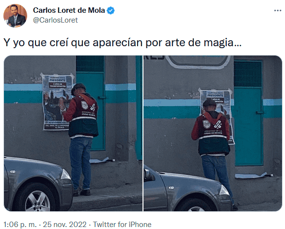 El periodista Carlos Loret de Mola exhibió la colocación de propaganda para la marcha del próximo 27 de noviembre, convocada por el Presidente Andrés Manuel López Obrador por sus cuatro años a la cabeza del Gobierno federal.A través de redes sociales, Loret de Mola publicó imágenes de cómo un hombre, vestido con chaleco del Gobierno de la Ciudad de México, coloca carteles para promocionar la marcha de López Obrador, que saldrá el domingo del Ángel de la Independencia al Zócalo."Y yo que creí que aparecían por arte de magia…", expresó Loret de Mola.La colocación de propaganda evidenciada por Loret de Mola se suma a la que se puso en las instalaciones del Metro esta semana y a las que han denunciado ciudadanos a través de redes sociales.El comediante Alex Marín y Kall "Ese Wey" compartió un video de cómo retiró "propaganda ilegal" de López Obrador.Sebastián Ramírez, presidente de Morena en la capital del país, expuso que ellos no pagaron por colocar la publicidad en el Metro, aunque dijo que hay muchas personas que quieren apoyar al Presidente.El Sindicato Nacional de Trabajadores del Sistema de Transporte Colectivo (STC) Metro, que preside Fernando Espino, se desmarcó de la publicidad."Ni el Sindicato ni los más de 14 mil trabajadores del Metro se encuentran participando en la difusión y colocación de publicidad política en las instalaciones del Metro, ni en los espacios publicitarios que el STC tiene en la red del Metro", dijo.OA