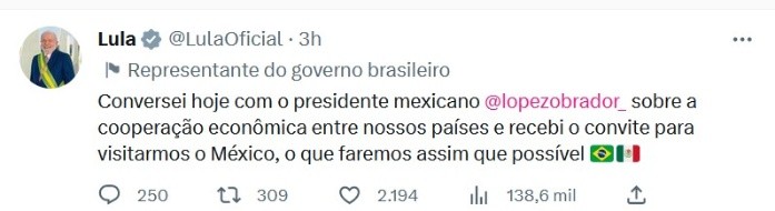 El presidente brasileño Luiz Inácio Lula da Silva informó este miércoles que conversó con su homólogo mexicano, Andrés Manuel López Obrador, sobre una "cooperación económica", en donde aseguró que recibió una invitación para visitar México, algo que hará lo antes posible.A través de una publicación en su cuenta de Twitter, Lula Da Silva anunció dicha cooperación luego de que sostuviera una llamada telefónica con López Obrador a primera hora del día, según su agenda."Conversé hoy con el presidente de México @lopezobrador_ sobre la cooperación económica entre nuestros países y recibí una invitación para que visitemos México, lo cual haremos lo antes posible", dijo Lula.Previamente, el Presidente Andrés Manuel López Obrador había informado que conversó con su homólogo de Brasil sobre la cooperación económica entre ambos países, y que lo invitó a visitar México.El pasado 17 de febrero, en Hermosillo, Sonora, López Obrador anunció que sostendría ese día una llamada telefónica con Lula da Silva, para hablar sobre el control inflacionario en ambos países."Es probable que hoy hablé por teléfono con el presidente Lula para algunos asuntos que estamos tratando sobre exportación e importación de alimentos, lo que tiene que ver con enfrentar de manera conjunta el fenómeno inflacionario, sobre ese tema básicamente", dijo en ese momento.JM