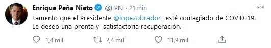 El ex presidente de México Enrique Peña Nieto publicó un tuit para desear pronta recuperación de Andrés Manuel López Obrador tras dar positivo a COVID-19."Lamento que el Presidente @lopezobrador_ esté contagiado de COVID-19. Le deseo una pronta y satisfactoria recuperación", escribió.Este domingo Andrés Manuel López Obrador informó que se contagio de COVID-19, y que aunque tiene síntomas leves ya se encuentra bajo tratamiento médico.El Mandatario señaló que mientras se encuentre en recuperación durante las mañaneras lo representará la secretaria de Gobernación, Olga Sánchez Cordero.