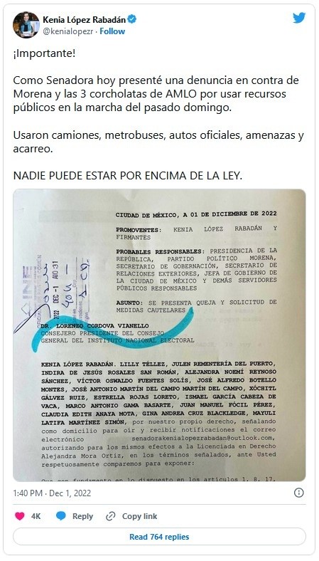 Senadores del PAN, PRI Y PRD presentaron este jueves una denuncia en contra del Presidente Andrés Manuel López Obrador, del partido político Morena, Adán Augusto López Hernández, encargado de la Secretaría de Gobernación (Segob); Marcelo Ebrard, secretario de Relaciones Exteriores, y Claudia Sheinbaum Pardo, jefa de Gobierno de la Ciudad de México, por diversas ilegalidades desplegadas con motivo de la marcha celebrada el 27 de noviembre de 2022.Kenia López, vicecoordinadora del PAN, destacó que presentó ante el Instituto Nacional Electoral (INE) un escrito de queja por las ilegalidades realizadas antes y durante la marcha del domingo pasado.Argumentó que en dicho evento "usaron recursos públicos para la promoción de la marcha, para el acarreo de personas, para pago de alimentación y por asistir al evento; así como coacción con la pérdida del empleo, cargo o comisión en caso de no asistir o la perdida de algún programa social. Igualmente, prometieron la inscripción a algún programa social en caso de asistir y desplegaron ilegalmente propaganda personalizada e inclusive tuvieron el descaro de utilizar el padrón de beneficiarios de programas sociales para hacer pase de asistencia de las personas que acudieron"."En un Estado de Derecho, no se pueden violar las reglas básicas que rigen a la democracia. El Presidente de la República y Morena están tratando desesperadamente de posicionar a su gobierno y a sus aspirantes a la Presidencia de la República, pero no lo vamos a permitir. Por ello, hoy presentamos ante la autoridad electoral esta queja y solicitamos se emitan las medidas cautelares respectivas para que se abstengan de volver a incurrir en actos similares a los denunciados", indicó.La denuncia firmada por una decena de senadores panistas, entre otros el coordinador Julen Rementería, la senadora del PRI, Claudia Anaya y el senador del PRD, Juan Manuel Fócil, fue acompañada de pruebas, con fotos y videos que hicieron llegar distintos ciudadanos a través de las redes sociales, los cuales constatan que existieron conductas ilícitas en la realización de dicho evento."Utilizaron ilegalmente los recursos públicos y la estructura de gobierno para amenazar a la gente y coaccionarla para asistir. Estos hechos deben ser denunciados", afirmó la legisladora panista.JM