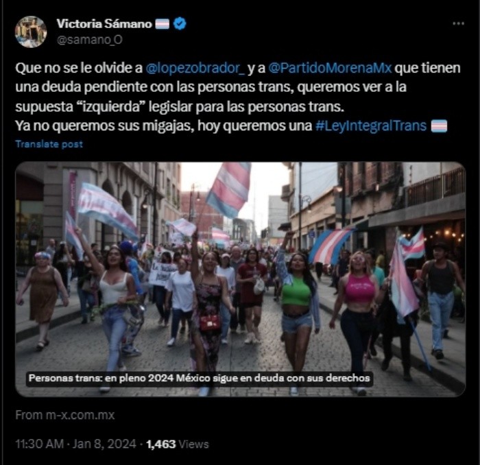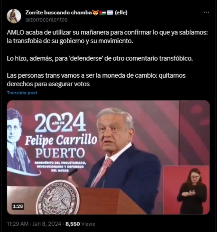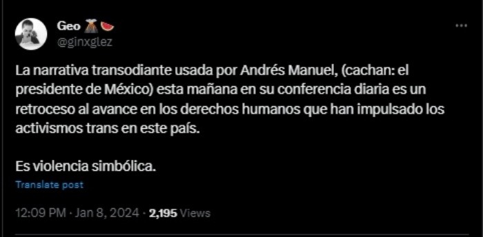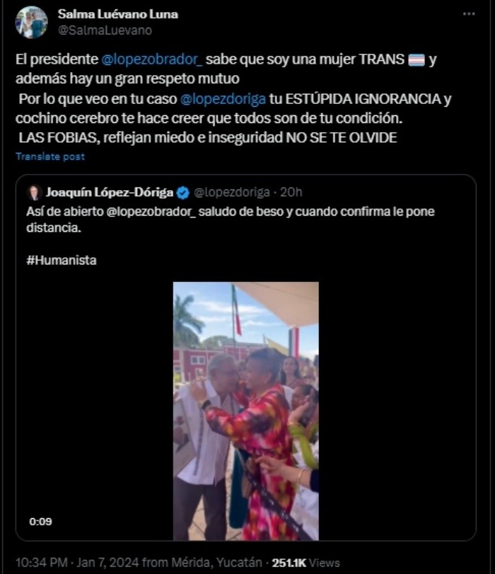 Durante su conferencia matutina de este lunes el Presidente de México Andres Manuel López Obrador se refirió a Salma Luévano, una diputada trans militante de Morena como “un señor vestido de mujer”. Esto sucedió después de que el fin de semana comenzará a circular un video donde ella le saludaba con un beso y él parecía alejarse. Después de que el presidente saludara a la diputada durante el fin de semana, Luévano aseguró en redes sociales que López Obrador sabía que es una mujer trans. Durante la “mañanera” de hoy el presidente mexicano respondió a estas acusaciones. “Criticandome porque le di un beso a un señor vestido de mujer” para continuar diciendo “yo beso a los hombres y me besan, el hombre tiene sentimientos”. En redes sociales se han hecho muchos comentarios al respecto de las declaraciones del presidente y diferentes colectivos LGBT, así como personas de la comunidad han señalado la transfobia del comentario del mandatario. Victoria Sámano, fundadora de LLECA - Escuchando la calle, una organización conformada por personas lgbt+ que brinda atención integral a personas lgbt+ y mujeres que se encuentran en situación de calle o en condiciones de riesgo, comentó a través de su cuenta de X. *Mantente al día con las noticias, únete a nuestro canal de WhatsApp aquí: https://whatsapp.com/channel/0029VaAf9Pu9hXF1EJ561i03