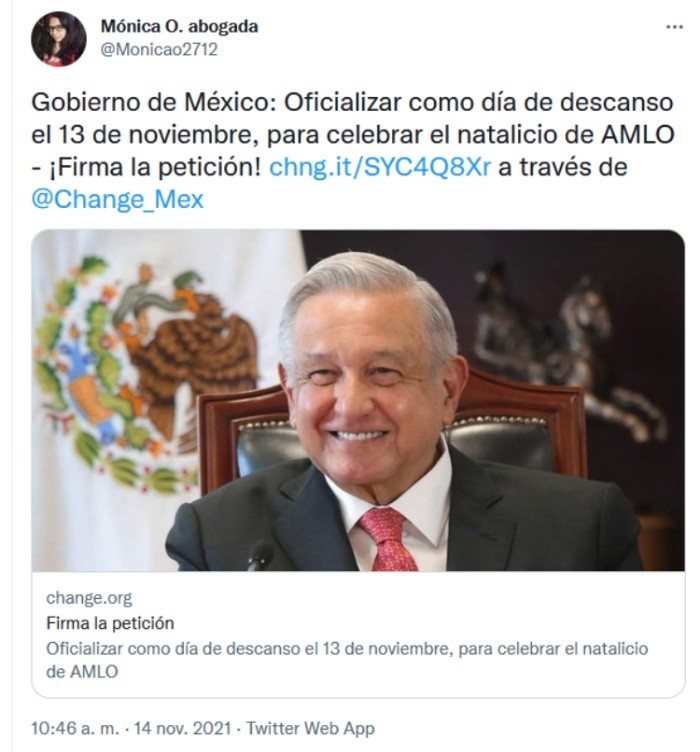 En redes sociales se ha viralizado una iniciativa con la que se pretende que se haga oficial que el natalicio del Presidente de México, Andrés Manuel López Obrador (AMLO) se establezca como un día de asueto. La idea, promovida por una usuaria de nombre Marisol Ordóñez en la plataforma change.org busca que la fecha sea día de descanso obligatorio.El Presidente AMLO nació un 13 de noviembre de 1953.La iniciativa sugiere que "es una forma de rendir homenaje por su incansable lucha (de AMLO) a favor de la justicia social y la igualdad de los seres humanos. Hasta la fecha únicamente se conmemora el natalicio de Benito Juárez".Al cierre de esta nota, la petición había recabado 380 firmas; para que sea tendencia se deben conseguir 500.La idea se volvió viral en redes sociales, porque hay quienes defienden que se establecería un nuevo "puente" o día de descanso obligatorio, y en algunos empleos el día se paga triple por trabajar.Por otro lado, hay quienes la critican al no compartir las ideas políticas del Mandatario Federal.OF
