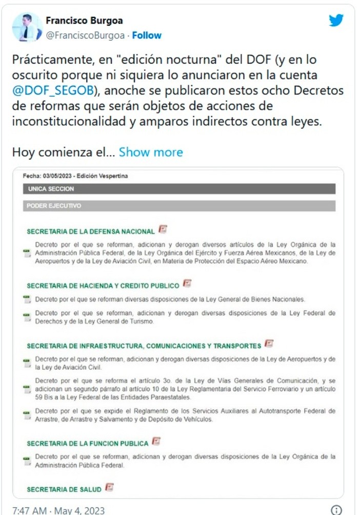 El Diario Oficial de la Federación publicó varios de los decretos aprobados por el Congreso de la Unión respecto a las reformas prioritarias para el Presidente Andrés Manuel López Obrador, entre ellas las que otorgan al Ejército por tiempo indefinido el control del Tren Maya, la que establece la seguridad del espacio Aéreo por parte de las Fuerzas Armadas y la que combate el tráfico de fentanilo.Una vez concluido el proceso legislativo, se promulgó la reforma al artículo Tercero de la Ley de Vías de Comunicación. El decreto adiciona un segundo párrafo al artículo 10 de la Ley Reglamentaria del Servicio Ferroviario y un artículo 59 Bis a la Ley Federal de las Entidades Paraestatales.De esta manera, la empresa perteneciente al Ejército Mexicano, Grupo Aeroportuario, Ferroviario y de Servicios Auxiliares Olmeca-Maya-Mexica S.A. de C.V., tendrá el control total del Tren Maya."El título de asignación a favor de entidades paraestatales tendrá una vigencia indefinida. Una vez otorgada dicha asignación, no podrán cederse o transferirse bajo ningún título; sólo podrá concluir cuando se acredite fehacientemente que no existe utilidad o intereses públicos", establece el decreto.Por otra parte, se publicó el decreto por el que se reforman, adicional y derogan diversos artículos de la Ley Orgánica de la Administración Pública Federal, de la Ley Orgánica del Ejército y a fuerza Aérea Mexicanos, de la Ley de Aeropuertos y de la Ley de Aviación Civil, en materia de Protección del Espacio Aéreo Mexicano, que establece que las Fuerzas Armadas podrán implementar acciones para garantizar que las operaciones aéreas en el territorio nacional no se realicen con fines ilícitos o atenten contra la seguridad nacional.Además, también se autoriza que la paraestatal controlada por la Secretaría de la Defensa Nacional (Sedena) pueda administrar aeropuertos y una Aerolínea de próxima creación, denominada Aerolínea del Bienestar.Se publicó además el decreto por el que se reforman, adicionan y derogan diversas disposiciones de la Ley Federal de Derechos y de la Ley General de Turismo, Que establece que el Tren Maya recibirá el 80 por ciento de los recursos que se obtengan por el pago de derechos de visitantes extranjeros, los cuales hasta ahora eran manejados por el Fondo Nacional de Fomento al Turismo (Fonatur).También se publica la reforma para el control de precursores químicos, conocida como "Ley antifentanilo".Se trata del decreto por el que se reforman, adicionan y derogan diversas disposiciones de la Ley Federal para el Control de Precursores Químicos, Productos Químicos Esenciales y Máquina para Elaborar Cápsulas, Tabletas y/o Comprimidos.A través de la coordinación interinstitucional se buscará prevenir, detectar y evitar el desvío o uso de precursores químicos, productos químicos esenciales y máquinas para elaborar cápsulas, tabletas o comprimidos, para la producción de drogas sintéticas.Indica que la Sedena, la Secretaría de Seguridad y Protección Ciudadana (SSPC), la Secretaría de Medio Ambiente y Recursos Naturales (Semarnat) y la Guardia Nacional (GN), coadyuvarán en esta tarea."Se prohíbe la importación o exportación de estas sustancias por vía postal, mensajería o paquetería".En torno a los delitos sobre este tema, establece que a la persona que desvíe o haga uso de precursores químicos o químicos esenciales para la producción de drogas sintéticas, se le impondrá pena de 10 a 15 años de prisión y multa equivalente al 10 por ciento de los ingresos obtenidos por dichas actividades.A la persona que tenga en posesión precursores químicos, productos químicos esenciales o máquinas para elaborar cápsulas, tabletas, o comprimidos en territorio nacional, que no cuente con las autorizaciones o permisos, se le impondrá pena de siete a 10 años de prisión y multa de mil a cinco mil el valor diario de la Unidad de Medida y Actualización (UMA).Otra de las reformas promulgadas es la de la Ley General de Bienes Nacionales, cuyo objetivo es cumplir con el mandato constitucional de administrar los recursos públicos con eficiencia, eficacia, economía, transparencia y honradez, con la finalidad de fortalecer a la Administración Pública Federal en la provisión de servicios otorgados por el Estado, en los que deberá prevalecer el interés público y la seguridad nacional.De acuerdo con la iniciativa aprobada en el Congreso, se busca fortalecer la rectoría de la nación y en consecuencia la capacidad de actuación de sus dependencias, con el fin de evitar grandes pérdidas en la venta de inmuebles propiedad del Estado. Los decretos entraron en vigor este jueves.JM
