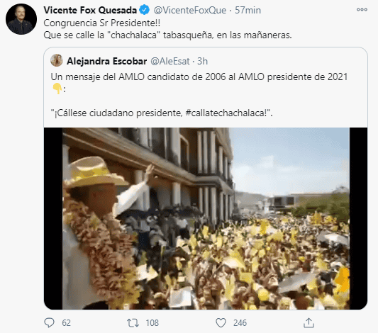 En medio de la polémica por la regulación de las llamadas mañaneras, el ex mandatario Vicente Fox pidió que el Presidente Andrés Manuel López Obrador guarde silencio en sus conferencias matutinas.A través de sus redes sociales Fox demandó "congruencia" a López Obrador, ya que el Presidente solicitó este miércoles no confundirse, porque las mañaneras son un espacio de información y no propaganda política."Congruencia Sr Presidente!! Que se calle la ‘chachalaca’ tabasqueña, en las mañaneras", escribió Fox en Twitter.En el marco de las elecciones presidenciales de 2006, el ahora Presidente López Obrador lanzó la expresión "cállate chachalaca" en contra de Vicente Fox por supuestamente intervenir en el proceso electoral.En su conferencia mañanera de este miércoles, López Obrador acusó a Lorenzo Córdova, presidente del Instituto Nacional Electoral (INE), de haberse hecho de "la vista gorda" en sexenios anteriores de actos propagandísticos que organizaba el gobierno federal, como nombrar a secretarios de Estado como delegados electorales.El Presidente López Obrador aseguró que con las conferencias de prensa se garantiza el derecho que tiene el pueblo de informarse, y acusó que en sexenios pasados había un control en los medios de comunicación.NR