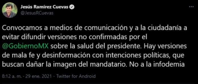 Jesús Ramírez Cuevas, vocero de la Presidencia de la República, aseguró esta mañana que hay versiones de mala fe y desinformación sobre la salud del Presidente Andrés Manuel López Obrador (AMLO) con intenciones políticas que, señaló, buscan dañar la imagen del Mandatario federal, quien el pasado domingo informó que dio positivo a COVID-19.En su cuenta de Twitter, el vocero presidencial llamó a medios de comunicación y a la ciudadanía a evitar difundir versiones no confirmadas por el Gobierno Federal sobre la salud del Ejecutivo federal.Esta mañana, en conferencia de prensa, Olga Sánchez Cordero, secretaria de Gobernación (Segob), aseguró que el Presidente López Obrador se encuentra muy contento, optimista y su salud mejora rápidamente, por lo que, consideró, en unos cuantos días se incorporará a sus actividades regulares.Ayer jueves Hugo López-Gatell, subsecretario de Prevención y Promoción de la Salud, reportó dos casos de infodemia -propagación de información falsa o manipulada con el propósito de desinformar y causar pánico- uno sobre el estado de salud del Mandatario federal y el otro sobre la efectividad de las vacunas."Estuvieron circulando en redes sociales, particularmente en WhatsApp mensajes completamente fuera de lugar diciendo que el Presidente había tenido un problema neurológico posiblemente hemorrágico o que tenía una parálisis facial o de alguna parte del cuerpo, esto completamente falso, completamente absurdo".En conferencia de prensa vespertina, el subsecretario señaló que ese tipo de mensajes busca dañar no solo imagen del Presidente sino la integridad del Estado mexicano, por lo que llamó a tener cuidado con ese tipo de desinformación.López-Gatell aseguró que carecen de sentido lógico los señalamientos de que el Presidente no está contagiado con coronavirus."¿Cuál sería la motivación de un jefe de Estado anunciar una enfermedad que no tiene? Será descabellado y no es la intención del Presidente, quien propaga esta versión son quiénes se atrincheran una postura del antivacunismo", manifestó.OF