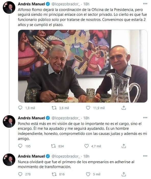El Presidente Andrés Manuel López Obrador (AMLO) anunció esta mañana que tras la salida de Alfonso Romo Garza del Gabinete federal, el cargo de Jefe de Oficina de la Presidencia quedará vacante, para ahorrar ese recurso."Ya no vamos a tener esa oficina, porque me va a seguir ayudando sin ser funcionario y vamos a aprovechar para ahorrar, no cobraba, la mayoría de su equipo no cobraba", dijo AMLO.El Presidente López Obrador pidió no caer en conjeturas o especulaciones sobre la salida de Romo. Aseguró que su renuncia fue porque ya no quería estar en el Gobierno, pero seguirá siendo su principal enlace con el sector privado."Si no se lee el mensaje se especula, se cae en conjeturas, (Romo) seguirá siendo mi principal enlace con el sector privado. Le pedí que aceptara ser funcionario y participó por dos años, a principios de año me lo recordó", declaró AMLO."Ponchó está más en mi visión de que lo importante no es el cargo, sino el encargo, nos va a seguir ayudando como enlace con el sector privado", compartió López Obrador.Señaló que hay muchos ciudadanos y empresarios a los que ha invitado a participar, porque simpatizan con su movimiento, pero ellos quieren ayudar de otra manera, sin cargos, porque actúan con libertad e independencia.Destacó que Romo Garza fue el primero de los empresarios en adherirse a su movimiento a pesar de las críticas de "su gremio" que lo veía con malos ojos.OA