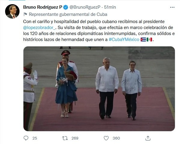 El presidente de México, Andrés Manuel López Obrador, llegó este sábado a Cuba, como parte de una gira que lo llevó a Guatemala, El Salvador, Honduras y Belice, para tratar el tema migratorio y reforzar los nexos políticos con la isla.López Obrador y la comitiva que le acompaña fueron recibidos por el ministro cubano de Exteriores, Bruno Rodríguez, en el Aeropuerto Internacional José Martí de La Habana.López Obrador, que llegó en un avión militar, no hizo declaraciones y no tiene previsto programa para este sábado.Durante su estancia en Cuba, el Mandatario mexicano se reunirá con su homólogo cubano, Miguel Díaz-Canel, y recibirá la Orden José Martí, la más alta condecoración que otorga el Gobierno de la isla.La visita de López Obrador ocurre en plena crisis migratoria que tiene a México como una de las vías escogidas por los migrantes cubanos en su intento por llegar a Estados Unidos.JM