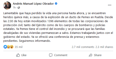 El Presidente de México, Andrés Manuel López Obrador (AMLO) confirmó el fallecimiento de una persona y 15 heridos tras la explosión que ocurrió la madrugada de este domingo en un ducto de Pemex en San Pablo Xochimehuacán. A través de redes sociales, AMLO detalló que desde las 02:30 horas de hoy domingo más de mil elementos de todas las corporaciones, tanto del Ejército, policías estatales y cuerpos de bomberos, están movilizándose en la zona para atender a los afectados.Además, AMLO indicó que buscarán brindar ayuda y protección a las miles de personas que tuvieron que ser desalojadas de sus viviendas. "Ya Pemex tiene el control del incendio y se procurará que las familias desalojadas de sus viviendas permanezcan a salvo. Estamos trabajando juntos con el gobierno del estado. Ya se ofreció una conferencia de prensa y estaremos pendientes. Seguiremos informando", escribió AMLO en sus redes sociales.Vecinos del lugar comenzaron a desalojar sus hogares por sí solos, aproximadamente a la una de la mañana, debido al fuerte olor a gas, y poco después se registraron las explosiones. La víctima fue identificada como Abimael, de 32 años, quien murió en el lugar de la explosión.GC