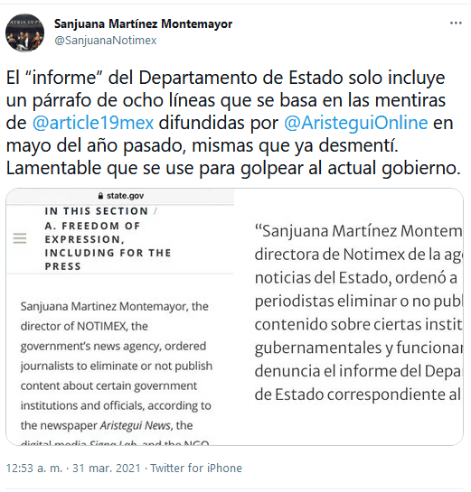 El Presidente de México Andrés Manuel López Obrador, criticó este miércoles a Estados Unidos por el informe del Departamento de Estado que señala a la periodista Sanjuana Martínez, directora de la agencia estatal Notimex, por "orquestar ataques" contra otros comunicadores."¿Por qué el Gobierno de Estados Unidos opina sobre cuestiones que solo competen a los mexicanos? ¿Por qué se lanzan en contra de Sanjuana, que ya la volvieron famosa? Además es una mujer que tiene todo nuestro respeto", expresó en su rueda de prensa matutina.Las declaraciones de López Obrador se producen un día después de publicarse el informe anual de derechos humanos que realiza el Departamento de Estado de Estados Unidos, que en esta ocasión corresponde al último año del Gobierno de Donald Trump.El reporte señala a la directora de Notimex, paralizada desde junio de 2020 por una huelga, porque "ordenó a periodistas eliminar o no publicar contenido sobre ciertas instituciones gubernamentales y funcionarios".El informe también cita que "el 12 de mayo (de 2020), Artículo 19 e ITESO, publicó un reporte sobre ataques contra periodistas orquestados por Sanjuana Martínez, directora de Notimex".La periodista aseguró este miércoles que el reporte de Washington se basa en mentiras "para golpear al actual Gobierno"."Solo incluye un párrafo de ocho líneas que se basa en las mentiras de Artículo 19 difundidas por (la periodista Carmen) Aristegui en mayo del año pasado, mismas que ya desmentí", manifestó en Twitter.AMLO defendió a la funcionaria, que él nombró en 2019, al afirmar que es "una periodista consecuente" y acusó a Artículo 19 de "pertenecer al movimiento conservador"."Resulta que esa asociación que se llama Artículo 19 está financiada por empresas extranjeras, hasta por el Departamento de Estado, para empezar nosotros no nos metemos a opinar sobre violaciones de derechos humanos en Estados Unidos", exclamó.El reporte de Washington también documentó que "periodistas que hacen preguntas difíciles al presidente durante sus conferencias de prensa reciben ataques vía Twitter".Este documento no es el primero que denuncia la estigmatización contra periodistas críticos con el Gobierno de López Obrador.México es el país más peligroso para el periodismo del hemisferio occidental, según el Comité para la Protección de Periodistas (CPJ, por sus siglas en inglés), con 8 periodistas asesinados en 2020 por su trabajo contabilizados por Artículo 19.Sobre la situación de Notimex, López Obrador ha descartado "despedir" a Martínez al opinar que "se puede con el diálogo" resolver la huelga que comenzó el 21 de febrero de 2020 en contra de los despidos hechos por la nueva directiva.GC