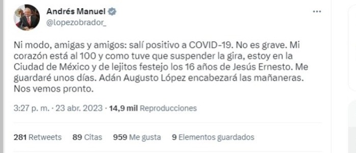 El Presidente Andrés Manuel López Obrador (AMLO) padece al menos de hipertensión, problemas de tiroides y del corazón.Este domingo se dio a conocer que se contagió por tercera vez de COVID, por lo que estará en reposo unos días, según señaló en redes sociales.Debido a sus antecedentes de gota, hipertiroidismo y “angina inestable de riesgo grave” ha comenzado a surgir la duda sobre si padece algo más grave. Aquí te decimos cuál es la información oficial hasta el momento del estado de salud de López Obrador.De acuerdo con la versión oficial del Presidente de México, se contagió por tercera ocasión de COVID y su estado de salud "no es grave".Señaló que "su corazón está al 100", aunque el año pasado se le tuvo que realizar un cateterismo.El Presidente aseguró en su publicación en Twitter que "se guardará" unos días. AMLO se encontraba en una gira en Yucatán cuando se sintió mal y tuvo que suspenderla, según confirma en esa misma publicación, por lo que tuvo que regresarse a la Ciudad de México, aunque no se informó si se encuentra en Palacio Nacional o en el Hospital Militar.López Obrador reconoció el año pasado que estuvo a punto de tener un infarto, por lo que tuvo que someterse al cateterismo.“Había un riesgo de infarto y me llevaron al hospital y me recomendaron un cateterismo, si ustedes se acuerdan de eso, me dijeron que hay que hacerlo, les pedí unos días. En eso me dio covid”, dijo en una mañanera el año pasado.El Mandatario federal dijo que Adán Augusto López será quien encabece las conferencias mañaneras por algunos días, mientras se él se mejora.