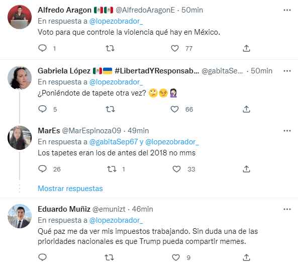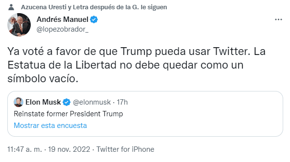 El Presidente de México, Andrés Manuel López Obrador dio de qué hablar este sábado, al “votar” a favor de que el exmandatario estadounidense, Donald Trump, regrese a Twitter, luego de que sus cuentas fueran canceladas tras el ataque al Capitolio en enero del 2021. Ayer viernes, el nuevo propietario de Twitter, Elon Musk publicó una encuesta en esta red social, donde preguntaba si debían reinstalar la cuenta de Trump. Y hoy, López Obrador retuiteó dicha encuesta, agregando que él “votó” a favor de que Trump regrese a las redes sociales, algo que causó polémica entre los usuarios. “Ya voté a favor de que Trump pueda usar Twitter. La Estatua de la Libertad no debe quedar como un símbolo vacío”, escribió en redes sociales.Cabe recordar, que la cuenta de Twitter y Facebook de Trump fueron suspendidas hace más de un año cuando ocurrió el ataque al Capitolio de Estados Unidos, tras considerar que sus mensajes incitaban a la violencia. Desde entonces, el Presidente mexicano ha externado su disgusto por esta situación, pues según él, atenta contra la libertad de expresión, e incluso, ha pedido a Elon Musk durante sus conferencias “mañaneras” que repare el daño creado tras haber cancelado la cuenta de Trump. Sin embargo, este comentario generó disgusto entre usuarios de redes sociales, pues recordaron que Trump ha atacado, múltiples veces, a los migrantes mexicanos. Aunque algunos otros le recordaron que mejor debería enfocarse en los problemas de inseguridad que vive el país.GC