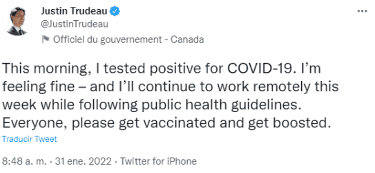El primer ministro de Canadá, Justin Trudeau anunció hoy que dio positivo a COVID-19, por eso el Presidente de México, Andrés Manuel López Obrador (AMLO) deseó "de corazón" que se recupere pronto. "Deseo de corazón que se recupere pronto de COVID-19 el buen amigo y primer ministro de Canadá, Justin Trudeau", dijo AMLO en un mensaje publicado en sus redes sociales, donde también compartió una foto de ambos dándose la mano en una reciente reunión.El primer ministro canadiense reveló este lunes que contrajo COVID, tras obtener un resultado positivo en un test realizado este mismo día, pero aseguró que se encuentra bien y seguirá trabajando de forma remota "siguiendo las normas de salud pública". Trudeau informó a través de su cuenta de Twitter del resultado positivo y solicitó a los canadienses que se vacunen y reciban la dosis de refuerzo contra el COVID.El positivo de Trudeau se produce cuando miles de personas se manifiestan en la capital canadiense desde el fin de semana para protestar contra las políticas y medidas adoptadas en Canadá para contener la pandemia. La presencia de elementos radicales del movimiento antivacunas y otros grupos extremistas provocó que Trudeau y su familia fueran trasladados de su residencia oficial a un lugar seguro no revelado en Ottawa. Trudeau es el tercer miembro de su familia que contrae la enfermedad. Al inicio de la pandemia, la esposa del político canadiense, Sophie Grégoire, se enfermó de coronavirus y se recuperó con normalidad. GC