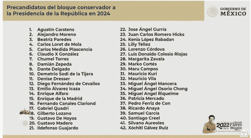 La semana pasada, el Presidente Andrés Manuel López Obrador sumó a la lista de “corcholatas” al diputado Gerardo Fernández Noroña, además de Ricardo Monreal para que sean candidatos presidenciales en las elecciones 2024Y este jueves, durante la “mañanera”, dio a conocer su lista de posibles candidatos del “bloque conservador”, en la que destacan el comediante Chumel Torres, el periodista Carlos Loret de Mola y la politóloga Denise Dresser.Al decir que se acabó con "el tapado", en la pantalla instalada en el Salón Tesorería puso la lista de los 42 aspirantes de la oposición que buscarían la candidatura por la Presidencia. Entre los 43 precandidatos de oposición se encuentra el exsecretario de Hacienda, Agustín Carstens; el presidente nacional del PRI, Alejandro Moreno, la senadora tricolor Beatriz Paredes; el exgobernador de Guanajuato, Carlos Medina Plascencia (PAN); el empresario Claudio X. González; el comediante Chumel Torres; el senador Damián Zepeda (PAN).Por parte de Movimiento Ciudadano está Dante Delgado, el exsenador Demetrio Sodi; la politóloga Denise Dresser, el excandidato presidencial Diego Fernández de Cevallos (PAN; el senador Emilio Álvarez Icaza, el gobernador de Jalisco Enrique Alfaro (MC); el exsecretario de Turismo Enrique de la Madrid (PRI), Fernando Canales Clariond (PAN), el excandidato presidencial Gabriel Quadri; el dirigente de FRENAA, Gilberto Lozano; el empresario Gustavo de Hoyos, el senador Gustavo Madero (PAN); el exsecretario de Economía, Ildefonso Guajardo (PRI).López Obrador se tomó el tiempo para mencionar a cada uno de los posibles candidatos, e incluso dijo algunos de sus cargos; al mencionar a Carlos Loret de Mola, no hizo más que decir “híjole” y dijo que serán los “machochones” quienes elijan a sus candidatos presidenciales.Incluso sobre la senadora de MC, Patricia Mercado, dijo que ella “les ayudó en 2016 en el fraude. Ustedes saben que para quitarnos votos de mujeres feministas, la impulsaron a ella”.Finalmente, también agregó al exgobernador de Tamaulipas, Francisco Javier García Cabeza de Vaca. GC