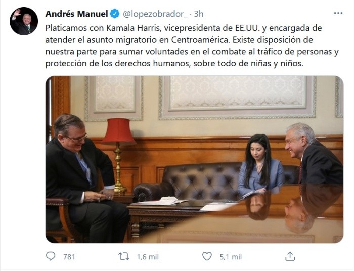El Presidente de México, Andrés Manuel López Obrador (AMLO), y la vicepresidenta estadounidense, Kamala Harris, dialogaron este miércoles sobre la creciente migración ilegal hacia Estados Unidos, informó AMLO a través de sus redes sociales."Existe disposición de nuestra parte para sumar voluntades en el combate al tráfico de personas y protección de los derechos humanos, sobre todo de niñas y niños", escribió AMLO en Twitter al confirmar la plática.Harris fue designada por el presidente estadounidense, Joe Biden, para abordar las causas de la migración de indocumentados en coordinación con los gobiernos de México, Guatemala, El Salvador y Honduras.El tema también ha sido tratado por Biden y AMLO durante conversaciones telefónicas sostenidas en enero y febrero.Estimulados por la expectativa de flexibilización de algunas políticas migratorias por parte de Biden, miles de centroamericanos indocumentados intentan ingresar a Estados Unidos a través de la frontera con México, incluidos cientos de menores que viajan solos.Joe Biden, sin embargo, ya advirtió que no habrá relajamiento en las restricciones migratorias.En febrero, casi 100 mil de esos inmigrantes fueron detenidos en la frontera, un regreso a niveles de mediados de 2019 tras un frenazo debido a la pandemia de coronavirus. La mayoría asegura huir de la pobreza y la violencia en sus países.JM