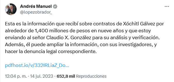 El Presidente Andrés Manuel López Obrador difundió unas gráficas con presuntos montos que suman más de mil 400 millones de pesos en negocios que las empresas High Tech Services y Operación y Mantenimiento a Edificios Inteligentes (OMEI), propiedad de la senadora Xóchitl Gálvez, firmaron en los últimos nueve años con empresas privadas y el gobierno federal, incluido el suyo.Entre las dependencias que han firmado contratos bajo el actual gobierno con estas dos empresas de la senadora están Petróleos Mexicanos (Pemex), Salud (Ssa), Servicio Nacional de Sanidad Inocuidad y Calidad Agroalimentaria (Senasica) y el Instituto Politécnico Nacional (IPN).En su cuenta de Twitter, el jefe del Ejecutivo federal señaló que envía esta información para que el empresario Claudio X. González y Mexicanos Contra la Corrupción y la Impunidad (MCCI) lo analicen y verifiquen. Indicó que el empresario y MCCI puede ampliar la información "y hacer la denuncia legal correspondiente"."Esta es la información que recibí sobre contratos de Xóchitl Gálvez por alrededor de mil 400 millones de pesos en nueve años y que estoy enviando al señor Claudio X. González para su análisis y verificación. Además, él puede ampliar la información, con sus investigadores, y hacer la denuncia legal correspondiente", dijo López Obrador.Antes, en su mañanera de hoy, López Obrador aseguró que las empresas de la senadora Xóchitl Gálvez han recibido mil 400 millones de pesos en contratos en los últimos nueve años.La senadora del PAN respondió en entrevista con Ciro Gómez Leyva que esto es falso, y que si le comprueban estos contratos renunciará a la candidatura a la presidencia por el Frente Amplio por México."Reto al presidente López Obrador a que demuestre que en 9 años mis empresas han obtenido contratos por mil 400 millones de pesos. Si me lo demuestra, yo renuncio a la candidatura, pero sino puede demostrarlo que él renuncie a la Presidencia", sostuvo.Durante su conferencia mañanera, el Presidente expuso que estos contratos se han otorgado con gobiernos anteriores, desarrolladores y de construcción."La información que me llegó es que en nueve años sus empresas, son dos, recibieron tanto de desarrolladores como de los gobiernos, mil 400 millones de pesos. Estamos hablando como de 120 millones por año", expuso.OF