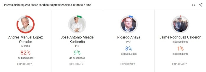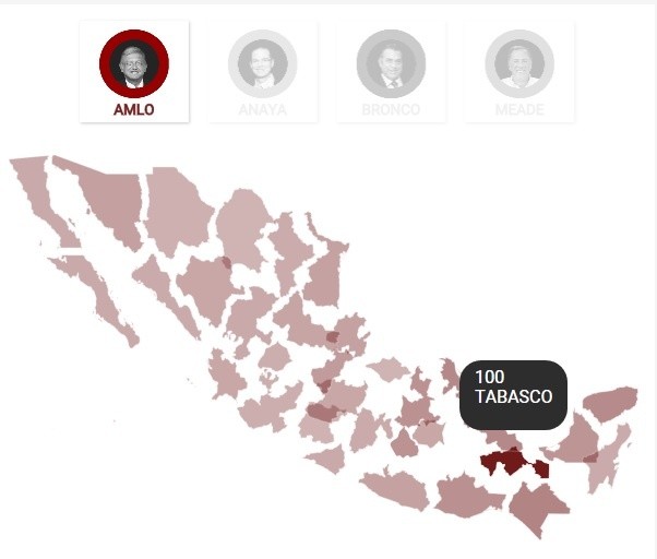 Andrés Manuel López Obrador va a la cabeza en las búsquedas realizadas en Google, este 1 de julio, de acuerdo con los Trends del buscador más grande del mundo.Desde las 16:00 horas hay un repunte en la cantidad de solicitudes de información relacionadas al Tabasco.El pico más alto, que se ve en la gráfica, coincide con el momento en el que el candidato presidencial de la coalición Juntos Haremos Historia emitió su voto, a unas horas de la apertura de casillas.La diferencia de búsquedas contra los candidatos presidenciales Ricardo Anaya, José Antonio Meade y Jaime Rodríguez siempre ha sido más alta, durante lo que va de la jornada electoral.La herramienta de Google Trends detecta la cantidad de peticiones de información que los internautas hacen al motor de búsqueda, sin importar que sean de apoyo o rechazo a cualquiera de los candidatos.JB