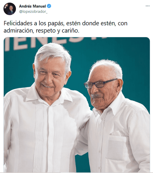 Este domingo que se conmemora el Día del Padre, el Presidente Andrés Manuel López Obrador (AMLO) envió un mensaje de felicitación a los papás mexicanos.En su cuenta de Twitter, López Obrador escribió: "Felicidades a los papás, estén donde estén, con admiración, respeto y cariño".Tras encabezar ayer sábado en Jerez, Zacatecas, la conmemoración por el centenario del fallecimiento del poeta Ramón López Velarde, AMLO regresará a la Ciudad de México en donde no tiene agendado ninguna actividad.Se prevé que en compañía de su esposa Beatriz Gutiérrez Müller e hijos celebre este Día del Padre.También en la red social, el general Luis Cresencio Sandoval, secretario de la Defensa Nacional (Sedena), felicitó a los papas, en especial a los padres militares."Hoy felicitamos a los #PadresMilitares y en general a los #PadresMexicanos."Ser padre es un privilegio, un sentimiento de orgullo y honor que conlleva a ser el apoyo, guía y ejemplo para los hijos", escribió.GC