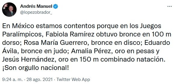 La delegación mexicana está logrando una gran participación en los Juegos Paralímpicos de Tokio 2020, ya suman 5 preseas, entre ellas dos de oro.Ante esto, el Presidente de México, Andrés Manuel López Obrador (AMLO), les dejó un emotivo mensaje en su Twitter a los atletas mexicanos que se han colgado preseas hasta ahora."En México estamos contentos porque en los Juegos Paralímpicos, Fabiola Ramírez obtuvo bronce en 100 m dorso; Rosa María Guerrero, bronce en disco; Eduardo Ávila, bronce en judo; Amalia Pérez, oro en pesas y Jesús Hernández, oro en 150 m combinado natación. ¡Son orgullo nacional!", escribió AMLO.Amalia Pérez y Jesús Hernández conquistaron las medallas de oro, ambos este sábado. Gracias a eso y de momento, México marcha en el lugar 19 del medallero.Si te interesó esta noticia y quieres saber más, entonces descarga y descubre INFORMAPlus, la aplicación digital de EL INFORMADOR, en donde tenemos contenidos exclusivos, seleccionados por nuestros editores, para darles una experiencia más completa a los lectores.Descarga la aplicación y pruébala GRATIS por treinta días.Para iOS: https://apple.co/35jaVgb Para Android: https://bit.ly/3gwVSEVSi eres suscriptor de EL INFORMADOR tu acceso está incluido, solicítalo al 33 3678-7777OA