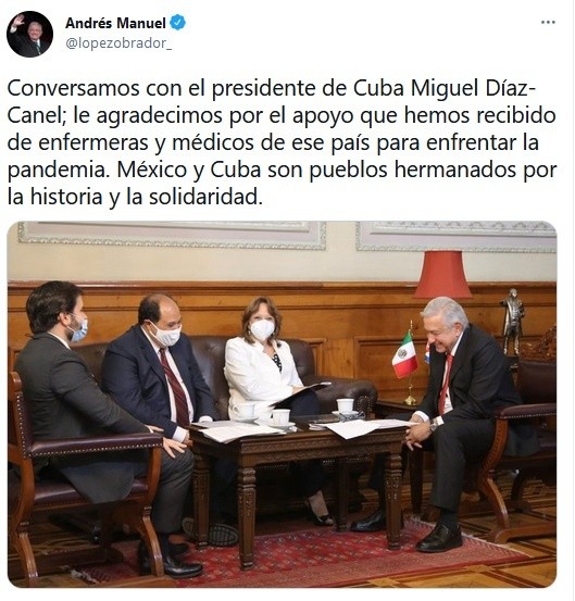 Como lo adelantó la mañana de este martes, el Presidente Andrés Manuel López Obrador (AMLO) sostuvo una conversación telefónica con el mandatario de Cuba, Miguel Díaz-Canel, a quien agradeció el apoyo recibido por esa nación al enviar mil especialistas, médicos y enfermeras a México para enfrentar la pandemia del COVID-19.En un mensaje difundido a través de redes sociales, López Obrador manifestó que México y Cuba son pueblos hermanados por la historia y la solidaridad."Conversamos con el presidente de Cuba Miguel Díaz-Canel; le agradecimos por el apoyo que hemos recibido de enfermeras y médicos de ese país para enfrentar la pandemia. México y Cuba son pueblos hermanados por la historia y la solidaridad", escribió el Presidente.Acompañaron a AMLO, Martha Delgado Peralta, subsecretaria para Asuntos Multilaterales y Derechos Humanos en la Secretaría de Relaciones Exteriores; Lázaro Cárdenas Batel, jefe de asesores de Presidencia; y Alejandro Svarch Pérez, titular de la Comisión Federal para la Protección contra Riesgos Sanitarios.En la mañanera de este martes, López Obrador adelantó que hablaría con Miguel Díaz-Canel para agradecerle por el apoyo y solidaridad, porque en el momento más difícil de la pandemia en México, Cuba envió una brigada de mil especialistas, médicos y enfermeras cubanos."Agradecemos mucho a esta brigada de médicos y enfermeras de Cuba. Hoy voy hacerlo de manera directa y personal, voy a hablar para agradecer este gesto solidario con el presidente de Cuba Díaz-Canel, para expresarle nuestro agradecimiento", declaró.Recordó que los especialistas cubanos se hicieron cargo de hospitales de la Sedena y del ISSSTE en Tláhuac con 220 camas, que ya estaba terminado y equipado, pero carecía de personal para la atención del coronavirus."El pueblo hermano de Cuba y su gobierno nos ayudaron en momentos difíciles, cuando se incrementó el número de contagios en el país, ellos nos enviaron alrededor de mil trabajadores de la Salud, enfermeras, especialistas y médicos, y ya se han retirado", expresó.Asimismo, López Obrador agradeció las muestras de apoyo de otros países hermanos que han ayudado a México a enfrentar la pandemia como Rusia, China, India y Estados Unidos.GC