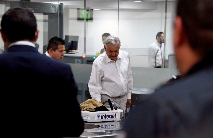 Viaja en clase turista, se fotografía con todo el mundo, deja que lo besen, abracen o lo tomen por la cintura, y sólo cinco personas desarmadas y sus amuletos lo cuidan. El Presidente Andrés Manuel López Obrador pone a temblar a policías y azafatas cuando sube a un avión comercial."Claro, las fotos que quieras", respondió sonriente AMLO a una mujer que lo interceptó con la cámara de su celular lista justo cuando caminaba a la sala del avión que lo llevó a Sinaloa, la tierra del capo Joaquín "Chapo" Guzmán, quien recibió un veredicto que lo dejará tras las rejas hasta su muerte.Detrás de la entusiasta mujer, en cuestión de segundos, remolinos de personas rodearon al Presidente que arrancó su gobierno jalando los bigotes de los feroces "huachicoleros", ladrones de gasolinas, lo que se tradujo en una amenaza directa a él en la que le exigieron la retirada de militares que combaten ese delito.López Obrador ordenó que las miles de escoltas militares que han cuidado a los presidentes hicieran trabajos "en beneficio del pueblo", y los sustituyó con una "Ayudantía", encabezada por Daniel Asaf, un restaurantero de origen libanés y excandidato para la Asamblea legislativa de la Ciudad de México.Ese cuerpo está integrado por profesionales que no están especializados en seguridad, su principal característica es su "lealtad".Tres mujeres y dos hombres de esa agrupación lo acompañaron a Sinaloa, y durante el periplo se concentraron en alejar a empujones a los reporteros y en pedirle "por favor" a la gente que soltara al presidente una vez tomada la selfie.Se trata de un Presidente con alta popularidad: un 80% de aceptación, según el último sondeo de la firma Mitofsky. Y esa masiva aceptación la amasó prometiendo en campaña reducirse el salario y el de los más altos funcionarios.El avión presidencial que solo usó su antecesor, un Boeing Dreamliner 787-8 que costó más de 218 millones de dólares, ya está a la venta en California, Estados Unidos."Cómo me voy a subir yo a ese avión habiendo tanta pobreza en México", ha dicho López Obrador.Así que él viaja en vuelos comerciales. A Sinaloa, parte del "Triángulo Dorado" conocido así por los grandes cultivos de mariguana y amapola, y zona de encarnizados choques entre narcotraficantes, llegó en un pequeño e incómodo Jet Embraer.Pero su afán por la austeridad al viajar comenzó desde su llegada a los filtros de seguridad del aeropuerto de la Ciudad de México, una zona custodiada por guardias privados desarmados.Atento con los trabajadores aeroportuarios, López Obrador se despojó de su celular, chamarra, de las monedas y llaves que traía en los bolsillos de su pantalón, y como cualquier pasajero también se quitó el cinturón. Desde lejos un policía federal asignado a la terminal aérea lo observaba."Cuando tiene que atravesar todo el aeropuerto para abordar es lo peor... la gente se le abalanza. Si un día alguien quiere hacerle algo no podremos impedirlo porque no le gusta que lo custodiemos", advirtió el oficial."Ya no puede andar así. Tiene que usar la sala VIP", concluyó el policía que prefirió guardar su anonimato. Al llegar a la fila para abordar, también fue presa fácil para la prensa.Tras mencionarle que se dirigía a una de las zonas más peligrosas del país, la AFP lo consultó sobre su falta de escoltas: "¿Trae por lo menos chaleco [antibalas]?"."Traigo mucha protección. Este es un ¡detente!", dijo mostrando la imagen del Sagrado Corazón de Jesús, un corazón rojo. "Detente, el corazón de Jesús está conmigo", respondió leyendo en voz alta la oración que acompaña la imagen. Un trébol y un dólar que le dio un migrante mexicano también forman parte de sus amuletos.Ya arriba del avión, desde su asiento pegado a la ventanilla seguía concediendo fotografías. Una de ellas a Carmen Díaz, un ama de casa de 52 años que viajaba a Sinaloa para una fiesta."Nunca me lo hubiera esperado. Yo en una ocasión pensé que esto [de viajar en el mismo vuelo] iba a ser inseguro para todos los pasajeros pero (...) al contrario porque vigilan más el vuelo", comentó feliz. "Vea a la gente cómo se amontona, lo rodean, la misma gente lo cuida", opinó Guillermo Von Boster, un capitán mercante de 68 años.Pero una enojada azafata opinó lo contrario. "Es horrible que venga en mi vuelo. La gente no hace caso de las indicaciones, se para de sus asientos, incluso en turbulencias, y la prensa no entiende que sus cámaras se pueden convertir en proyectiles en caso de que el avión sufra un imprevisto. Espero que nunca viaje con mi familia", comentó Alejandra Martínez.Al bajar del avión, el Mandatario recibe como primera escena en el aeropuerto de Culiacán, Sinaloa, a una multitud entre las que están simpatizantes y coléricas esposas de cientos de policías fallecidos en la lucha contra el narcotráfico.Sin tener tiempo de atenderlas, López Obrador se perdió entre la multitud para dirigirse custodiado por un convoy de escoltas del gobernador estatal a Badiraguato.IM