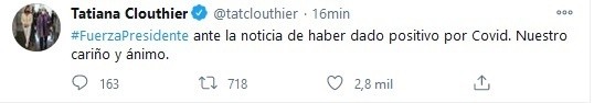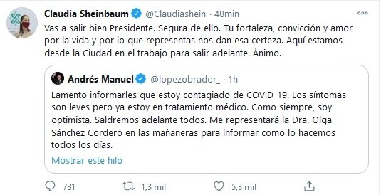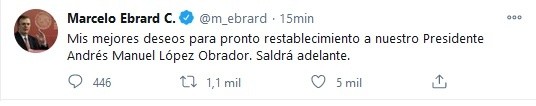 Después de que este domingo el Presidente Andrés Manuel López Obrador (AMLO) informara que dio positivo a COVID-19, personalidades de la política reaccionaron a la noticia y desearon pronta recuperación al Mandatario.El Secretario de Relaciones Exteriores de México, Marcelo Ebrard escribió: "Mis mejores deseos para pronto restablecimiento a nuestro Presidente Andrés Manuel López Obrador. Saldrá adelante".El expresidente Felipe Calderón, Tatiana Clouthier y la jefa de gobierno de la Ciudad de México Claudia Sheinbaum también se unieron a los deseos.