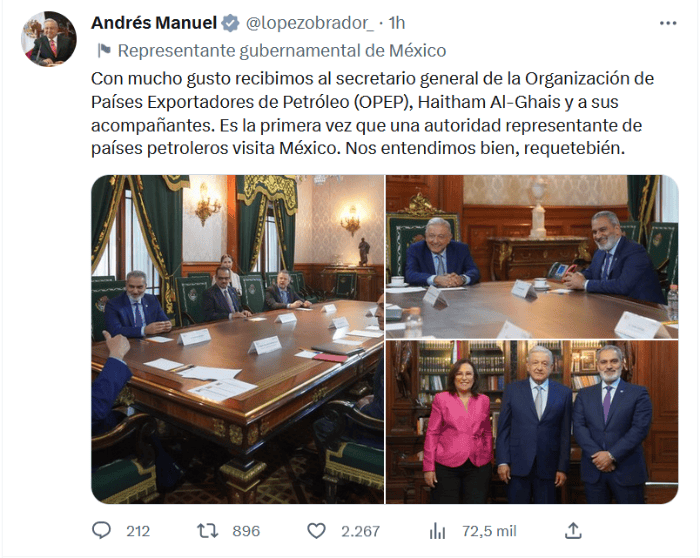 El Presidente Andrés Manuel López Obrador dijo que en su encuentro con Haitham Al-Ghais, secretario general de la Organizaciones de Países Exportadores de Petróleo (OPEP), donde hubo entendimiento, "requetebién", de ambas partes.Por medio de sus redes sociales, donde difundió fotografías de la reunión, López Obrador destacó que es la primera vez que una autoridad representante de países petroleros visita México."Con mucho gusto recibimos al secretario general de la Organización de Países Exportadores de Petróleo (OPEP), Haitham Al-Ghais y a sus acompañantes. Es la primera vez que una autoridad representante de países petroleros visita México. Nos entendimos bien, requetebién", dice.En la reunión con Haitham Al-Ghais, el Presidente López Obrador estuvo acompañado por el secretario de Hacienda, Rogelio Ramírez de la O; la secretaria de Energía, Rocío Nahle García, y el director de Pemex, Octavio Romero Oropeza.Alrededor de las 12:00 horas, el secretario general de la OPEP salió Palacio Nacional luego de reunirse con el Presidente López Obrador.El funcionario de la OPEP arribó al filo de las 11:00 de la mañana y una hora después salió por la calle de Moneda sin dar declaraciones.Un poco antes salió de Palacio Nacional el director general de Pemex, Octavio Romero Oropeza.JM