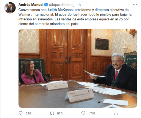 El Presidente de México, Andrés Manuel López Obrador, sostuvo este martes un encuentro en Palacio Nacional con la presidenta y directora ejecutiva de Walmart Internacional, Judith McKenna.A través de sus redes sociales, López Obrador informó que con McKenna acordó "hacer todo lo posible para bajar la inflación en alimentos (...) las ventas de esta empresa equivalen al 25 por ciento del comercio minorista del país", escribió el presidente López Obrador.Durante la "mañanera" de hoy, López Obrador señaló que su gobierno atiende el tema de la inflación e informó que sostendría un encuentro con Judith McKenna."En energéticos no tenemos problema. Tenemos que resolver lo de alimentos, y en eso estamos ya trabajando. Que no aumente la canasta de 24 productos básicos, debe de costar mil 38 pesos. Hicimos el acuerdo con Walmart, con Chedraui, con Soriana y con otros distribuidores y productores. Hoy, creo, precisamente voy a recibir a la gerente mundial de Walmart, y un tema es el de los precios de los básicos", adelantó López Obrador.GC