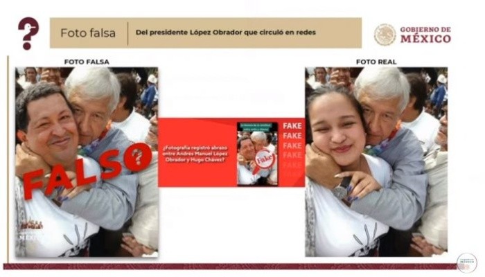 El Presidente Andrés Manuel López Obrador aclaró que nunca vio personalmente al expresidente de Venezuela, Hugo Chávez, pero manifestó que lo respeta y nunca le faltará el respeto, pues recordó que ya falleció.Esto, luego que en redes sociales se difundiera una foto falsa donde supuestamente aparece el Mandatario federal abrazando a Hugo Chávez."Aclarar lo de la foto, lo del finado presidente Chávez decir que yo nunca lo vi, pero lo respeto como respeto a todos los dirigentes, porque no es decir era malísimo. La política no es maniquea, no es de buenos y malos, tiene que ver con circunstancia."No lo vi, nunca hable con él, pero no le voy a faltar al respeto, menos si es finado, eso también que quede claro, y cada quien tiene su conciencia tranquila, si estos conservadores reaccionarios, clasistas como racistas y sobre todo muy corruptos porque son muy sinvergüenzas inician una campaña en contra de alguien y creen que con eso desprestigian", dijo.vll