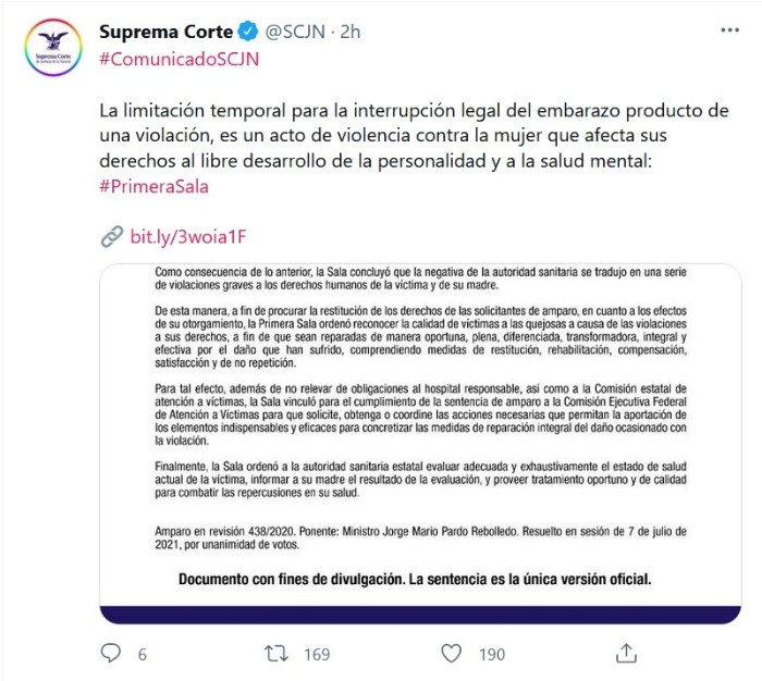 La Suprema Corte de Justicia de la Nación (SCJN) declaró inconstitucional la criminalización de mujeres víctimas de violación que abortan después de los primeros tres meses de embarazo en el estado de Chiapas.Por unanimidad, la Primera Sala de la Corte declaró inconstitucional el artículo 181 del Código Penal de Chiapas que únicamente prevé el aborto legal en casos de violación cuando éste se practica en los 90 días posteriores a la concepción.De este modo, la Corte concedió un amparo a una mujer cuya hija menor de edad con parálisis cerebral fue violada en el año 2018 y a quien el Hospital General de Tapachula le negó la práctica del aborto porque ya había excedido el tiempo permitido por la ley."El Estado no puede obligar a la mujer víctima de una violación a asumir sacrificios en su persona, como lo es continuar con un embarazo, y a ofrendar sus propios derechos en beneficio de terceros o del interés general", señala el proyecto elaborado por la ministra Norma Lucía Piña Hernández y avalado por la Primera Sala."Establecer una limitación temporal para que no se le aplique la sanción del delito de aborto, desconoce la naturaleza de las agresiones sexuales y las afectaciones a la salud mental que éstas generan en las víctimas de los delitos sexuales, particularmente, en el caso a las mujeres, las cuales muchas veces, por la naturaleza traumática de los actos de violencia sexual que les generan y por la estigmatización social que el simple hecho de manifestarlo les crea, no se atreven a mencionarlo ni a denunciarlo ante las instancias ministeriales".La víctima acudió al hospital con 23 semanas de embarazo, por lo que las autoridades del lugar negaron practicarle el aborto por el tiempo de gestación y porque el director del lugar señaló que su parálisis cerebral implicaba un riesgo para practicar el procedimiento quirúrgico.La Corte ordenó a las autoridades de salud de Chiapas tomar diversas medidas de reparación y compensación a las quejosas por daño moral, misma que fijará la Comisión Ejecutiva de Atención a Víctimas, a pesar de que la menor sí pudo abortar.JM
