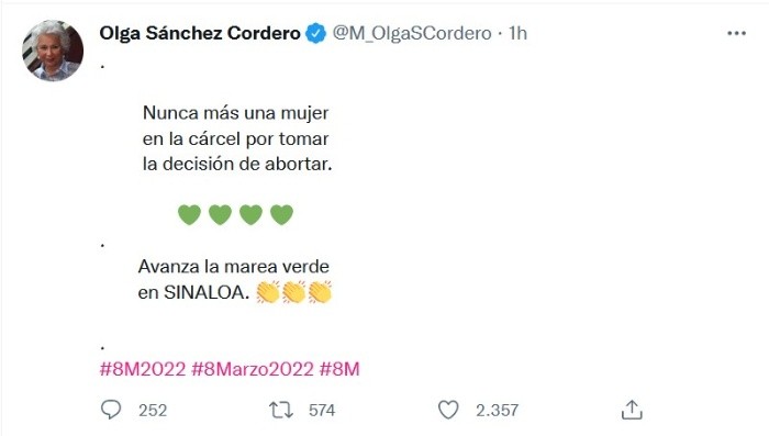En el marco de la conmemoración del Día Internacional de la Mujer, el Congreso de Sinaloa aprobó este martes en lo general y en lo particular una ley que permite la interrupción legal del embarazo hasta las 13 semanas de gestación.Con 28 votos a favor, dos en contra y nueve abstenciones, Sinaloa se convirtió en el séptimo estado en el país en aprobar dicha ley."Nunca más una mujer en la cárcel por tomar la decisión de abortar. Avanza la marea verde en Sinaloa", apuntó en un mensaje en Twitter Olga Sánchez Cordero, presidente de la mesa directiva del Senado mexicano.Con la decisión, Sinaloa se une a la Ciudad de México, Oaxaca, Veracruz, Hidalgo, Baja California y Colima como los siete de los 32 estados que permiten la interrupción del embarazo hasta las 12 semanas sin importar la causa.En el resto del país se permite por violación y algunos estados tienen causales por viabilidad del feto, salud de la madre y pobreza extrema.Durante la presentación de la iniciativa, la secretaria de la mesa directiva, Nela Rosiely Sánchez, del partido Movimiento Regeneración Nacional (Morena), dijo que penalizar el aborto "es un tipo de violencia de género" ya que ante la prohibición se someten a prácticas clandestinas.JM