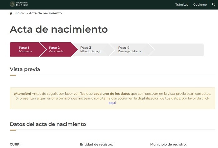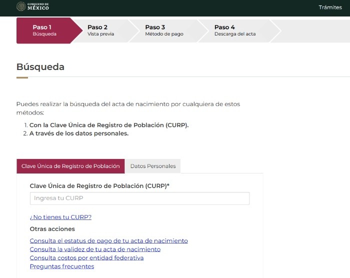 El acta de nacimiento 2023 en México es un documento que sirve para acreditar la identidad ante organismos o autoridades públicas que lo soliciten, constando de modo fehaciente junto a los datos personales, la localidad, la provincia y el país de nacimiento de una persona. Aquí te decimos cómo la puedes descargar o imprimir de Internet.El acta de nacimiento es un documento que se requiere para realizar diversos trámites, y desde hace algún tiempo, se puede descargar e imprimir de Internet. Aunque para tramitar una copia certificada puedes acudir a las oficinas del registro civil, también puedes conseguir una desde la comodidad de tu casa siguiendo estos pasos:1- Ingresa a la página oficial https://www.gob.mx/ActaNacimiento/2- Puedes buscar tu acta colocando la Clave Única de Registro de Población (CURP) en el campo que se te indicaSi no tienes el dato, puedes hacerlo escribiendo tus datos personales3- Valida el código captcha4- Ingresa los datos de madre o padre que te registró para comprobar tu acta, ya que estos aparecen como datos de filiación en tu acta de nacimiento5- Verifica que cada uno de los datos que aparecen en la vista previa sean los correctos6- Da click en confirmar y continuar7- Al ser un documento oficial, debes realizar un pago en línea, con cargo a tu tarjeta de crédito o débito. El costo de una copa certificada del acta de nacimiento al 13 de marzo de 2023 es de 88 pesos para Jalisco. Puedes consultar los precios de cada entidad aquí8- Da click en confirmar forma de pago9- Una vez realizado el pago, puedes descargar tu acta de nacimiento en formato PDF10- Puedes imprimir tu acta de nacimiento en papel tipo bondEsta copia certificada de tu acta de nacimiento impresa en papel bond es válida ante cualquier autoridad municipal, estatal y federal.OF