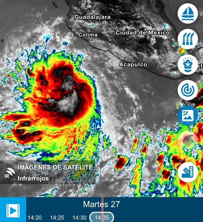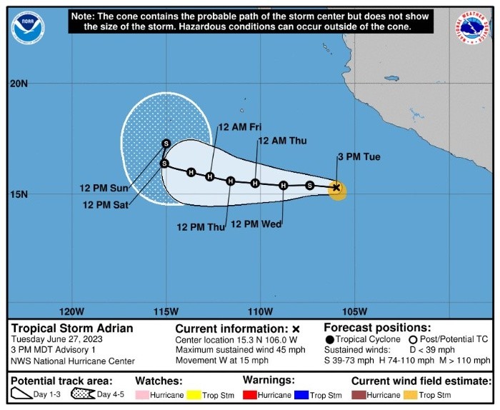 El ciclón "Adrián" ha evolucionado y se convirtió en la primera tormenta tropical de la temporada en el Pacífico.El Centro Nacional de Huracanes (NHC, por sus siglas en inglés) informó que se espera que la tormenta tropical "Adrián" se convierta en huracán el miércoles 28 de junio.El centro de la tormenta está ubicado a aproximadamente 430 kilómetros al suroeste de Punta San Telmo, Michoacán; y a 450 kilómetros al sur-suroeste de Manzanillo, Colima, de acuerdo con la Comisión Nacional del Agua (Conagua Clima) y el Servicio Meteorológico Nacional (SMN).La tormenta ocasionará lluvias fuertes en Jalisco, Colima, Michoacán y Guerrero, debido a la ruta que ha tomado.