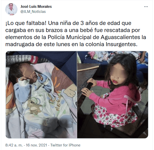 Policías del municipio de Aguascalientes, en el estado homónimo, rescataron a una niña de tres años que caminaba por la calle con una bebé en brazos.Según información de medios nacionales, una mujer, al ver sola a la niña que cargaba a la bebé, las llevó a su casa donde las refugió, reportó su presencia y esperó la llegada de los uniformados.La niña no supo dar información sobre su nombre, el de sus papás, o su domicilio, por lo que fueron puestas bajo resguardo de las autoridades, y luego trasladadas al DIF estatal.De acuerdo con los reportes, las menores fueron evaluadas y se encontraron en buen estado de salud.Ahí se mantendrán hasta que sus padres o familiares las reclamen.OF