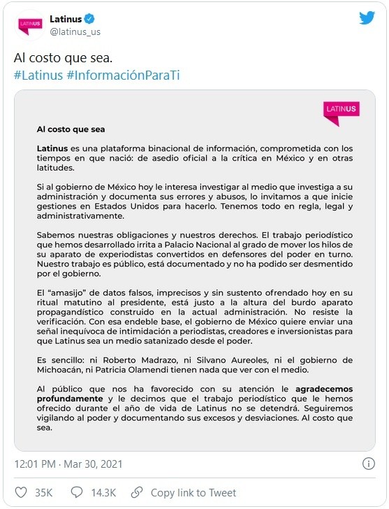 Luego de que el Presidente Andrés Manuel López Obrador (AMLO) señalara que tenía información de supuestos vínculos de políticos con el medio Latinus, la plataforma respondió que seguirán vigilando al poder y documentando sus excesos y desviaciones "al costo que sea".A través de redes sociales, Latinus, que tiene como colaboradores a Carlos Loret de Mola y a Víctor Trujillo, respondió que es una plataforma binacional de información, "comprometida con los tiempos en que nació: de asedio oficial a la crítica en México y en otras latitudes", además que negó cualquier relación con políticos."Si al gobierno de México hoy le interesa investigar al medio que investiga a su administración y documenta sus errores y abusos, lo invitamos a que inicie gestiones en Estados Unidos para hacerlo. Tenemos todo en regla, legal y administrativamente"."Sabemos nuestras obligaciones y nuestros derechos. El trabajo periodístico que hemos desarrollado irrita a Palacio Nacional al grado de mover los hilos de su aparato de experiodistas convertidos en defensores del poder en turno"."Nuestro trabajo es público, está documentado y no ha podido ser desmentido por el gobierno", refirió Latinus.En la conferencia mañanera de este 30 de marzo en Palacio Nacional, el periodista Álvaro Delgado mencionó "un amasijo" de empresarios, políticos y periodistas que están detrás de la plataforma Latinus.Al respecto, AMLO declaró que tenía información de esta supuesta relación de políticos con el medio, "porque aquí llega de todo"."Ya no hay espionaje, pero hay mucha inteligencia porque la gente nos informa, pero no consideramos que nos correspondía denunciarlo porque queremos que la vida pública sea cada vez más pública y que no haya censura, refirió López Obrador."Están en su derecho de confrontarnos políticamente", declaró el Presidente.Latinus agregó que "el ‘amasijo’ de datos falsos, imprecisos y sin sustento ofrendado hoy en su ritual matutino al Presidente, está justo a la altura del burdo aparato propagandístico construido en la actual administración. No resiste la verificación. Con esa endeble bases, el Gobierno de México quiere enviar una señal inequívoca de intimidación a periodistas, creadores e inversionistas para que Latinus sea un medio satanizado desde el poder"."Al público que nos ha favorecido con su atención le agradecemos profundamente y le decimos que el trabajo periodístico que le hemos ofrecido durante el año de vida de Latinus no se detendrá. Seguiremos vigilando al poder y documentando sus excesos y desviaciones. Al costo que sea", puntualizó el medio.JM