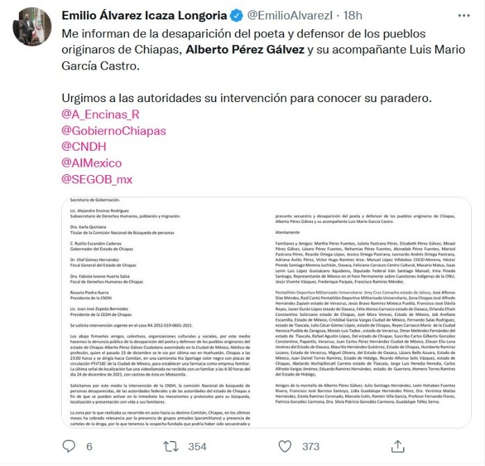 Alberto Pérez Gálvez, poeta y activista defensor de pueblos originarios de Chiapas, así como su acompañante, Luis Mario García Castro, se encuentran desaparecidos desde la madrugada del pasado 24 de diciembre cuando transitaban por el municipio de Motozintla, denunciaron familiares, activistas y artistas.A través de un comunicado, alertaron que el también autor del libro "La Piel de fuego" salió del municipio de Huehuetán aproximadamente a las 23:00 horas del 23 de diciembre hacia la ciudad de Comitán de Domínguez, en la ruta de la Sierra Mariscal.Cerca de las 04:30 horas del día siguiente, próximo al municipio de Motozintla, Pérez Gálvez intentó comunicarse mediante una videollamada al teléfono de un familiar, pero debido a la hora no respondió.Después se perdió comunicación con ambos, quienes viajaban en una camioneta Kia Sportage, color negro, con placas de circulación PYJ718C.Debido a esto, familiares y amigos de Alberto Pérez y Luis Mario García solicitaron de manera urgente la aplicación del protocolo de búsqueda a través de un documento dirigido a autoridades estatales y federales.Los denunciantes advirtieron que en los últimos meses la zona por donde transitaban el activista y su acompañante ha tenido relevancia por la presencia de grupos paramilitares, por lo que "tenemos la sospecha fundada que podría haber sido secuestrado y posteriormente desaparecido junto con su acompañante Luis Mario García Castro", se lee en el texto difundido en redes sociales.JM