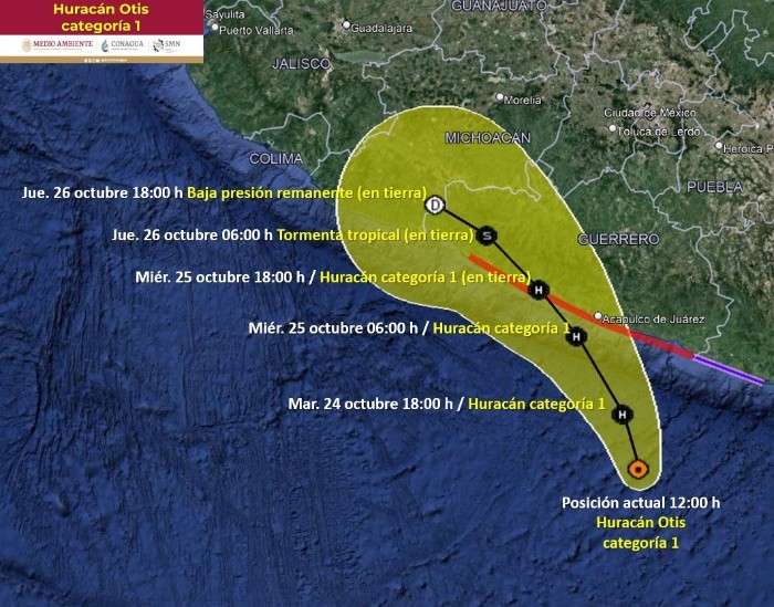 "Otis" se ha intensificado a huracán de categoría 1 en la escala Saffir-Simpson y amenaza la costa de Guerrero, informó el Servicio Meteorológico Nacional (SMN), fuente oficial del Gobierno de México en materia climática. El SMN señaló que la tormenta tropical "Otis" se ha intensificado a huracán de categoría 1 en la escala Saffir-Simpson, su centro se localiza frente a las costas de Guerrero. Su amplia circulación favorece el ingreso de humedad del Océano Pacífico hacia el centro y sur del territorio nacional, reforzando la probabilidad de lluvias en dichas regiones, además de rachas de viento y oleaje elevado en costas de Guerrero y Oaxaca.El sistema se encuentra a 175 km al sur-suroeste de Punta Maldonado, Guerrero, y a 235 km al sur-sureste de Acapulco, Guerrero. "Otis" mantiene vientos máximos sostenidos 130 km/h y rachas de 155 km/h. Se esperan lluvias intensas con puntuales torrenciales (150 a 250 mm) en Guerrero; lluvias puntuales intensas (75 a 150 mm) en Oaxaca; lluvias fuertes (25 a 50 mm) en el Estado de México, Morelos y Puebla; e intervalos de chubascos (5 a 25 mm) en Michoacán y la Ciudad de México. Dichas lluvias a partir de fuertes podrían originar visibilidad reducida, deslaves, encharcamientos o inundaciones, así como incremento en los niveles de ríos y arroyos.Además, se mantendrá en estrecha vigilancia por su aproximación a las costas de Oaxaca y Guerrero; además, se prevén de rachas de viento de 80 a 100 km/h y oleaje de 3 a 5 metros de altura en costas de Guerrero y Oaxaca.Se espera que el huracán "Otis" toque tierra mañana miércoles 25 de octubre, a 5 km al noreste de Técpan de Galeana, Guerrero, y a 90 km al oeste-noroeste de Acapulco, Guerrero.Autoridades piden extremar precauciones a la población en general en las zonas de los estados mencionados por lluvias, viento y oleaje (incluyendo la navegación marítima) y atender las recomendaciones emitidas por las autoridades del Sistema Nacional de Protección Civil, en cada entidad.Con información del Servicio Meteorológico Nacional* * * Mantente al día con las noticias, únete a nuestro canal de Whatsapp * * *OA