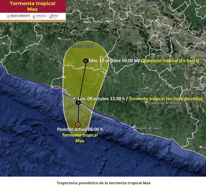 La tormenta tropical "Max" mantiene en alerta a las autoridades, luego de que esté próxima a tocar tierra, al sur-sureste de Zihuatanejo, Guerrero, mientras mantiene un desplazamiento hacia el norte; señaló el Servicio Meteorológico Nacional (SMN), fuente climática oficial del Gobierno de México.La situación actual es que el centro de la tormenta tropical "Max" se localiza al sur-sureste de Zihuatanejo, Guerrero, y se desplaza hacia el norte; su amplia circulación ocasiona lluvias intensas con puntuales torrenciales, rachas de viento y oleaje elevado en costas del Pacífico Sur y occidente de México."Max" se encuentra a 80 km al sur-sureste de Zihuatanejo, Guerrero, y a 140 km al sur-sureste de Lázaro Cárdenas, Michoacán. A su vez, se mantiene zona de prevención por efectos de tormenta tropical desde Acapulco, Guerrero, hasta Punta San Telmo, Michoacán.El desplazamiento actual del sistema es hacia el norte (10°) a 8 km/h, además, mantiene vientos máximos sostenidos de 85 km/h y rachas de 100 km/h.Se pronostican rachas de viento de 90 a 110 km/h y oleaje de 4 a 6 metros de altura en las costas de Guerrero, Michoacán y Colima, rachas de viento de 50 a 70 km/h y oleaje de 1 a 3 metros de altura en costas de Jalisco. Además, se mantienen condiciones para la formación de trombas marinas frente a costas de Guerrero, Michoacán y Colima. Autoridades piden extremar precauciones a la población en general en las zonas de los estados mencionados por lluvias, viento y oleaje (incluyendo la navegación marítima) y atender las recomendaciones emitidas por las autoridades del Sistema Nacional de Protección Civil, en cada entidad.Se espera que "Max" se encuentre en línea de costa este mismo mediodía para que, mañana, se convierta en depresión tropical ya en tierra.Con información del Servicio Meteorológico NacionalOA