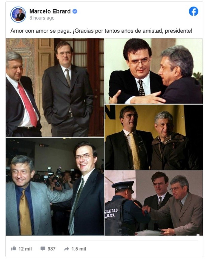 En el camino rumbo a la carrera presidencial, el canciller Marcelo Ebrard Casaubón agradeció en redes sociales al Presidente Andrés Manuel López Obrador por su amistad en los últimos años."Amor con amor se paga. ¡Gracias por tantos años de amistad, presidente!", escribió el secretario de Relaciones Exteriores en su cuenta de Facebook, acompañando su mensaje con distintas fotografías con López Obrador.En su conferencia matutina, al ser cuestionado sobre la sucesión, el Presidente dijo: "Yo quiero mucho a Claudia, a Adán, imagínense, es mi paisano, Marcelo está haciendo un trabajo de primera".Los fines de semana, Ebrard Casaubón ha acompañado a los aspirantes de Morena a las gubernaturas que se definirán en junio próximo, donde ha sido recibido al grito de "¡presidente!"JM