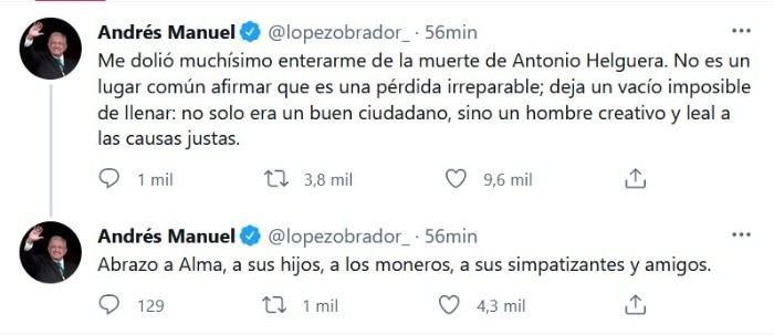 La noche de este viernes el coordinador de Opinión de "La Jornada", Luis Hernández, dio a conocer a través de su cuenta de Twitter sobre el fallecimiento del monero Antonio Helguera."La Jornada" señaló que el caricaturista murió a causa de un infarto a la edad de 55 años."Me dolió muchísimo enterarme de la muerte de Antonio Helguera. No es un lugar común afirmar que es una pérdida irreparable; deja un vacío imposible de llenar: no solo era un buen ciudadano, sino un hombre creativo y leal a las causas justas", escribió el Presidente López Obrador en su cuenta de Twitter. Apenas el martes de había reunido con él en Palacio Nacional.El Mandatario también expresó sus condolencias a familiares y amigos del ilustrador.JM