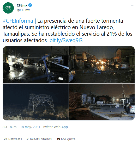 Un total de 157 mil 228 usuarios se quedaron sin luz en las últimas hora debido a una tormenta con fuertes vientos en Nuevo Laredo, Tamaulipas, sin embargo, 21% de los afectados ya recuperó el servicio."La presencia de una fuerte tormenta con vientos de más de 150 kilómetros por hora en Nuevo Laredo causó que (...) se interrumpiera el suministro de energía a 157 mil 228 usuarios, por daño en 11 líneas de trasmisión, colapsando 14 estructuras, 141 postes y 1 antena de comunicación", informó en un boletín la Comisión Federal de Electricidad (CFE).Hasta el momento, indicó la compañía estatal, se ha restablecido el suministro a 33 mil 014 clientes, lo que significa el 21 % de avance.Estos representan el 12% del total de usuarios de la CFE en esta región.Para la atención de la emergencia, que dejó postes de electricidad dañados e incluso tumbados, se han dispuesto 248 trabajadores electricistas, 75 vehículos y 43 grúas."La CFE está preparada para atender posibles afectaciones del suministro eléctrico, ya que cuenta con planes específicos para la atención de emergencias", aseguró la compañía.El país ha registrado varios apagones desde finales de diciembre en el norte del país, especialmente en Tamaulipas.En diciembre se dio un apagón masivo que dejó temporalmente sin luz a más de diez millones de personas.Y a mediados de febrero, coincidiendo con la tormenta invernal que azotó con fuerza el norte de México y sobre todo Texas, otros 5.9 millones de usuarios de varios estados del país se quedaron sin luz.GC