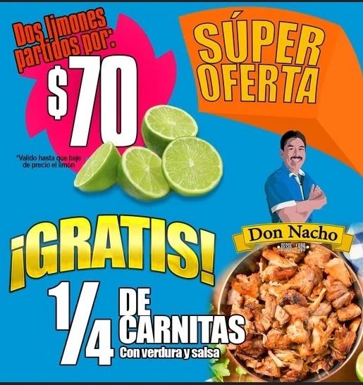 Durante el inicio del 2022 hemos sido testigos de un aumento importante en el precio del kilo de limón, el cual alcanza hasta los 80 pesos. Y no sólo los consumidores están sufriendo las consecuencias, también diversos negocios, entre ellos, las taquerías.No obstante, la creatividad muy al estilo de México no se ha hecho esperar y un taquero hidalguense, cuyo negocio lleva por nombre "Don Nacho" implementó una ingeniosa estrategia.Esta oferta consiste en que, en la compra de dos limones, por 70 pesos, te llevas gratis un cuarto de carnitas con verdura y salsa.En la publicación de sus redes sociales, posteó: "Aprovecha esta súper oferta que Chicharrón & Carnitas Don Nacho trae para ti 100% real no feik".Además, compartió que esta sería válida hasta que el limón baje de precio.Sin duda, esta es una buena estrategia de mercadotecnia para recuperarse del alza en el precio del limón, ya que consumirlo actualmente es considerado un lujo.Horario de la taquería Lunes, martes, jueves, viernes, sábado y domingo: 8:00 a 18:00 horas. Miércoles: 7:00 a 18:00 horas. Dirección: La taquería se encuentra ubicada en calle Pensador Mexicano esquina con María del Carmen. Colonia Centro Norte, Actopan, Hidalgo.La taquería se caracteriza por vender productos elaborados artesanalmente 100% de puerco, tales como longaniza, chicharrón, carnitas, tierritas y manteca, ya sea que lo degustes por taco o por kilo.JM