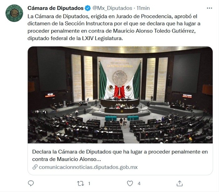 El pleno de la Cámara de Diputados, erigido en Jurado de Procedencia, le quitó el fuero al diputado del Partido del Trabajo, Mauricio Toledo Gutiérrez, para que la Fiscalía General de Justicia de la Ciudad de México (FGJCDMX) pueda proceder en su contra por la presunta comisión del delito de enriquecimiento ilícito.En un acto en el que no estuvo presente el acusado, se avaló el dictamen de la Sección Instructora por 381 votos a favor por parte de Morena, PAN, PRD, PVEM, PES, MC, y la mayoría del PRI; 24 en contra de los legisladores del PT, así como 37 abstenciones por parte de algunos tricolores, de Morena y del PVEM.Durante el juicio, Rafael Chong Flores, Fiscal Especializado en Combate a la Corrupción de la Ciudad de México, reveló que Mauricio Toledo, diputado federal del Partido del Trabajo acusado de enriquecimiento ilícito, abandonó el país desde el pasado 26 de julio."Tenemos una información de última hora por parte de las autoridades migratorias, de que el diputado Mauricio Toledo abandonó desde hace algunos días, el 26 de julio pasado, el territorio nacional con destino a la República de Chile", señaló.En sus alegatos, explicó que del 1 de octubre 2012 al 21 de agosto de 2018, periodo en que se desempeñó como jefe delegacional en Coyoacán y diputado local de la Ciudad de México, Toledo Gutiérrez incrementó su patrimonio injustificada e inexplicablemente.En su oportunidad, el abogado defensor Epigmenio Mendieta, aseguró que en el dictamen de la Sección Instructora hubo un interés directo y una clara parcialidad por parte del presidente Pablo Gómez, quien compitió por un cargo por el mismo distrito que Toledo Gutiérrez en Coyoacán."Por lo tanto podemos concluir que lo que presenciamos el día de hoy es una venganza política, los hechos son de hace nueve años, esos delitos estarían prescritos, la Fiscalía tuvo la oportunidad durante 2012 y hasta 2020 de atender el caso, pero no lo hicieron", aseveró.Por Morena, Alfonso Ramírez Cuéllar sostuvo que el desafuero se trata de una advertencia "para que se sepa que no se puede hacer uso ilegal de un financiamiento que iba para una causa noble como la reconstrucción de la Ciudad de México", por lo que adelantó que su bancada votaría a favor."Esta es una advertencia para actuar con honestidad en todos los cargos donde desarrollamos la función pública, no es persecución política", aseveró.La bancada del Partido del Trabajo (PT) se retiró de la sesión, al calificar el acto como "algo cercano a un circo"."El grupo parlamentario del PT ha tomado la decisión de abandonar esta sesión, no participaremos en esto que consideramos evidentemente algo muy cerca a un circo que ya ha tomado una decisión", declaró Benjamín Robles, vicecoordinador del PT, aunque al final, desde sus oficinas, votaron en contra.Si te interesó esta noticia y quieres saber más, entonces descarga y descubre INFORMAPlus, la aplicación digital de EL INFORMADOR, en donde tenemos contenidos exclusivos, seleccionados por nuestros editores, para darles una experiencia más completa a los lectores. Si eres suscriptor de EL INFORMADOR tu acceso está incluido, solicítalo al 33 3678-7777Descarga la aplicación y pruébala GRATIS por treinta días.Para iOS: https://apple.co/35jaVgbPara Android: https://bit.ly/3gwVSEVJM