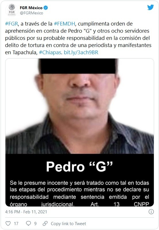 Autoridades federales detuvieron a nueve policías de Tapachula, Chiapas, por el delito de tortura a una periodista y a manifestantes ocurrido en enero de 2020 en esa localidad.Según informó el jueves la Fiscalía General de la República en un comunicado, la reportera estaba narrando cómo agentes municipales agredían a personas de la zona que se manifestaban para pedir un camino rural cuando fue detenida arbitrariamente.Entre los detenidos está Pedro "G", quien era jefe de la policía local en ese momento.La ONG de defensa de la prensa, Artículo 19, denunció en su momento la detención de la periodista, que previamente había puesto dos denuncias por amenazas en su contra e indicó que había sido agredida físicamente y despojada de sus pertenencias.Asimismo, en su comunicado del 28 de enero del año pasado, explicaba que otro reportero fue pateado por los policías en distintas partes del cuerpo y sobre todo en la cabeza mientras cubría la manifestación.La fiscalía especializada en delitos contra los periodistas consideró que había pruebas suficientes para acusarles de tortura.JM