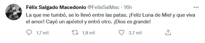 El senador Félix Salgado Macedonio se burló del exdirector de la Unidad de Inteligencia Financiera (UIF), Santiago Nieto Castillo, quien renunció después del escándalo que provocaron sus invitados a su boda con la consejera del Instituto Nacional Electoral (INE), Carla Humprey Jordán.Salgado Macedonio escribió un mensaje en sus redes sociales la noche del lunes: "La que me tumbó, se lo llevó entre las patas. ¡Feliz luna de miel y que viva el amor! Cayó un apóstol y entró otro. ¡Dios es grande! Abrazos a todas y todos".La noche del lunes, se hizo pública la renuncia de Nieto Castillo como director de la UIF y el nombramiento del ex perredista, Pablo Gómez Álvarez.En el pasado proceso electoral, el INE canceló el registro de la candidatura de Morena a la gubernatura de Guerrero de Salgado Macedonio por no haber presentado gasto de su precampaña.Humprey Jordán votó a favor de la cancelación de la candidatura de Salgado Macedonio.Tras la cancelación de la candidatura, Salgado Macedonio encabezó protestas fuera del INE en la Ciudad de México para que se le restituyeran, sin embargo el Tribunal Electoral de la Federación ratificó la sanción contra el senador.Sobre esas protestas, Nieto Castillo criticó la actitud de Salgado Macedonio.JM