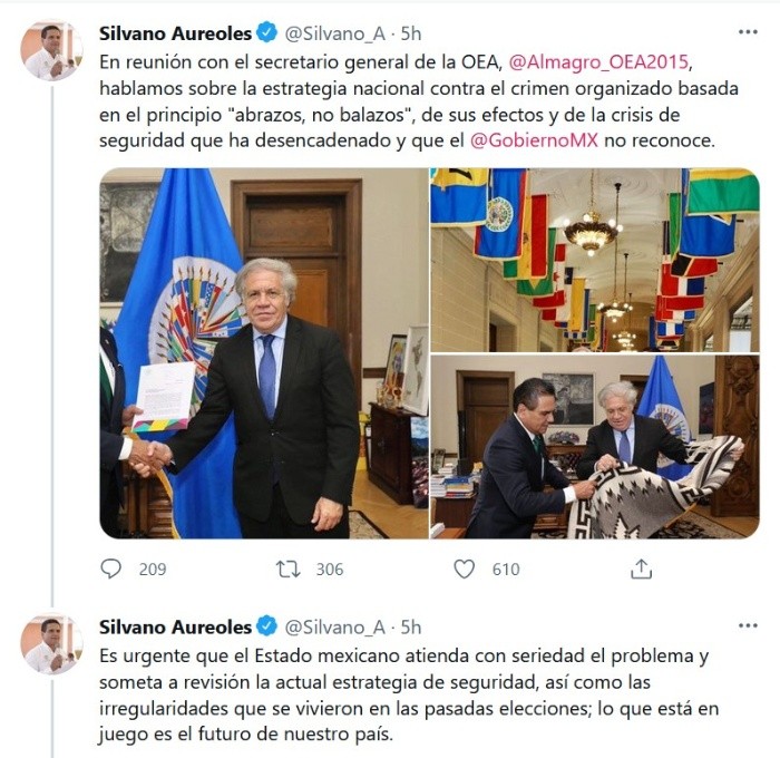 El gobernador de Michoacán, Silvano Aureoles, se reunió con el secretario general de la Organización de los Estados Americanos (OEA), Luis Almagro, a quien le pidió que no abandone a México que está en riesgo de convertirse en un "narcoestado".En Twitter, el mandatario estatal aseguró que es urgente que el Estado mexicano atienda con seriedad el problema y someta a revisión la actual estrategia de seguridad, así como las irregularidades que se presentaron en las elecciones."México es un factor determinante para la estabilidad de la región y lo que pase en nuestro país afecta a todo el continente", señaló.Y agregó: "lo que está en juego es el futuro de nuestro país".El gobernador de Michoacán detalló que en reunión con Almagro abordaron la estrategia nacional contra el crimen organizado basada en el principio "abrazos, no balazos", misma que impulsa el Presidente Andrés Manuel López Obrador (AMLO)."Hablamos sobre la estrategia nacional contra el crimen organizado basada en el principio "abrazos, no balazos", de sus efectos y de la crisis de seguridad que ha desencadenado y que el @GobiernoMX no reconoce", aseguró Silvano Aureoles.En su gira de trabajo por los Estados Unidos, Aureoles alertó a los organismos internacionales sobre la "terrible crisis de inseguridad que vive México".Aureoles Conejo se reunió con Luis Almagro Lemes, secretario general de la OEA, y le entregó un documento sobre lo que consideró "la estrategia fallida del Gobierno federal".El mandatario michoacano reiteró que los "abrazos y no balazos" se traducen en "una posición permisiva y omisa ante la violencia criminal".Prueba de ello, citó, son las casi 90 mil muertes violentas en 31 meses del actual Gobierno federal, un "número histórico de pérdidas de vidas", agregó.Además, denunció la presunta participación del crimen organizado en las pasadas elecciones del 6 de junio en las que se eligieron 15 gubernaturas, 30 congresos locales, mil 900 ayuntamientos y juntas municipales en todo el territorio mexicano.Dijo que eso que aumenta el riesgo de que sea la delincuencia la que elija al próximo Presidente de México."No deje solo a México en este escenario de riesgo que puede llevarnos a la configuración paulatina de un narcoestado", agregó Silvano Aureoles en la misiva dirigida a Almagro Lemes.El gobernador de Michoacán urgió la participación de la OEA para que el Estado mexicano "reconozca la gravedad del problema, y auxilie en la revisión de la actual estrategia nacional de seguridad".Si te interesó esta noticia y quieres saber más, entonces descarga y descubre INFORMAPlus, la aplicación digital de EL INFORMADOR, en donde tenemos contenidos exclusivos, seleccionados por nuestros editores, para darles una experiencia más completa a los lectores.Descarga la aplicación y pruébala GRATIS por treinta días.Para iOS: https://apple.co/35jaVgbPara Android: https://bit.ly/3gwVSEVJM